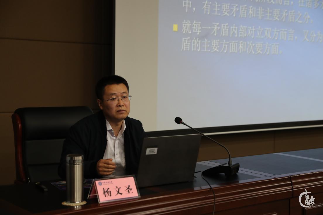 杨文圣以《普遍性和特殊性相统一视角谈中国共产党百年成功之道》为题,从《矛盾论》《实践论》《反对本本主义》等著作出发,带领大家从原著中了解基本原理,分析指出处理好普遍性和特殊性的关系是贯穿党百年历程的根本线索,中国共产党的百年历程是科学社会主义在中国的实践过程,是开创中国道路、推进马克思主义中国化的伟大历程。