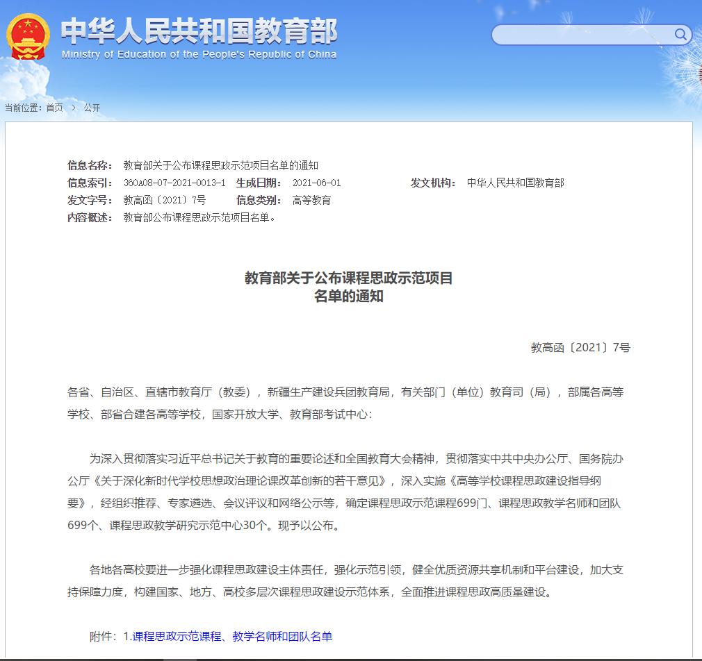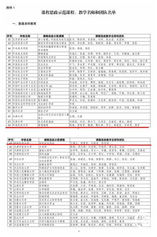 本网讯 近日,教育部发布课程思政示范课程名单。经组织推荐、专家遴选、会议评议等程序,确定课程思政示范课程699门、课程思政教学名师和团队699个、课程思政教学研究示范中心30个。中国民航大学《普通物理》《信息安全导论》两门课程入选获评为示范课程。