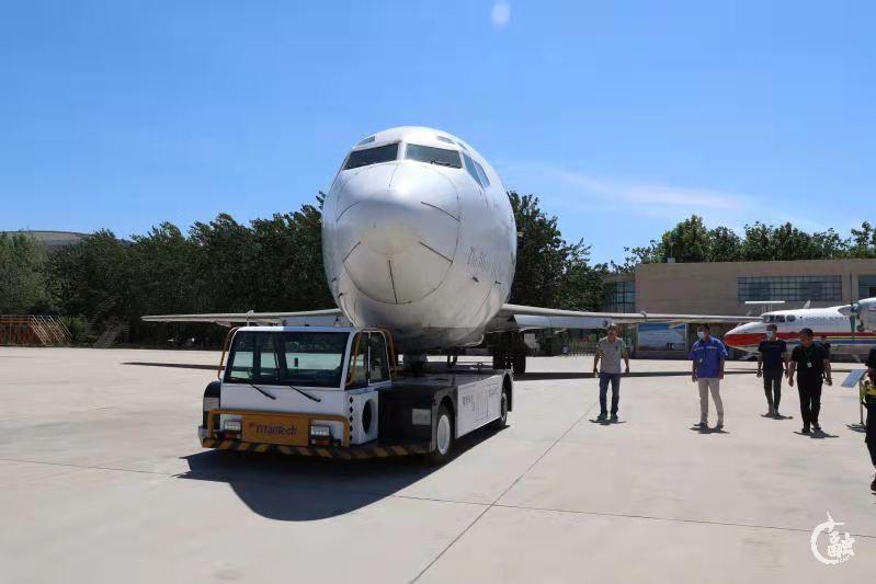 本网讯 6月18日,由中国民航大学和上海提坦科技有限公司联合研发,上海提坦科技制造的国产完全自主知识产权的纯电动无拖把飞机牵引车在中国民航大学实验实习机坪完成的与Boeing727飞机的“第一抱”。这一抱的成功标志着纯国产无拖把飞机牵引车实验完成,即将投入规模生产。
