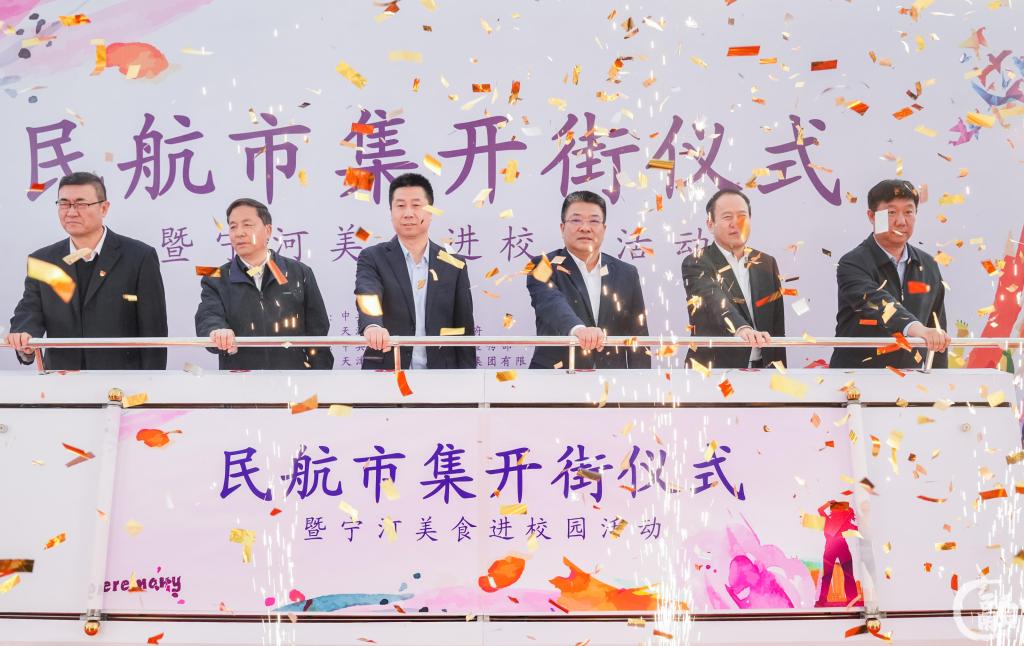 惠冰宣布中国民航大学民航市集开街,惠冰、张勇勤、沈洁,曹胜利、王志强、中国民航大学飞行分校党委书记孙伟共同启动民航市集开街暨宁河特色美食进校园活动。当天共有6家宁河非遗美食代表出席,开业商户共计19家。师生们品尝美食,了解宁河非遗文化,感受宁河热情,了解宁河品牌。