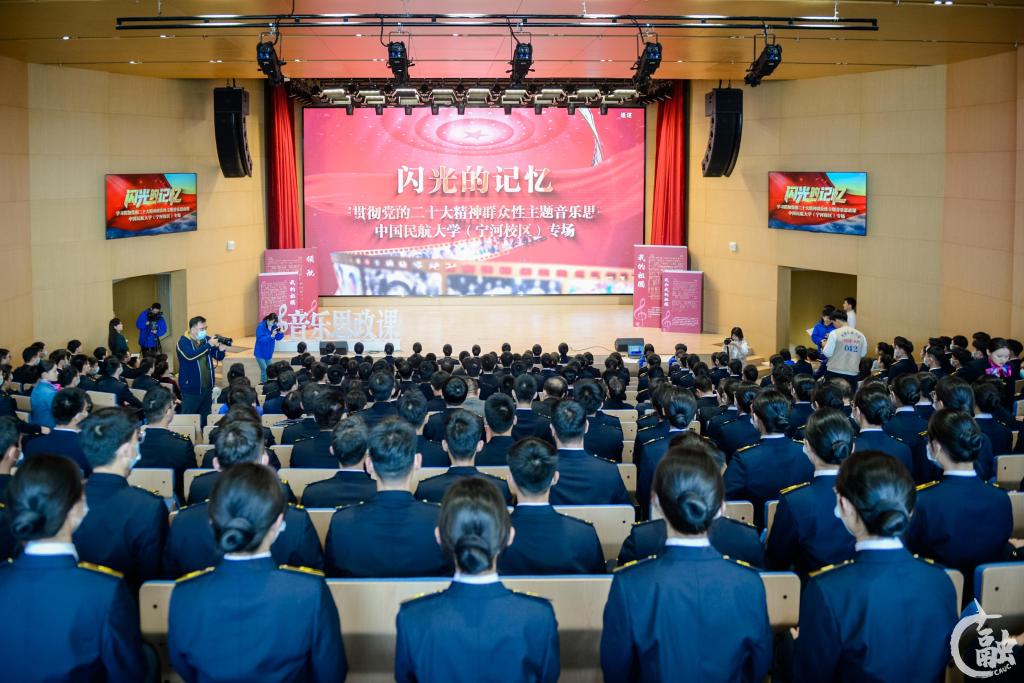 “闪光的记忆”学习贯彻党的二十大精神群众性主题音乐思政课中国民航大学宁河校区专场活动,以音乐为载体,采用视频播放、宣讲人演讲、歌曲渲染等形式,以具体生动的榜样人物为“活教材”,引导广大师生赓续好精神血脉,凝聚起“强国复兴有我”的奋进之力,鼓起迈进新征程、奋进新时代的精气神。音乐思政课再现共产党人为国家发展人民幸福“抛头颅、洒热血”的鲜活故事,讲述中国民航大学首任校长方槐点燃新中国的“航空火种”的故事,以及惊心动魄的“两航起义”,展现了历代共产党员不怕牺牲,突破重重阻碍取得成功的不屈不挠精神。主讲人中,有来自宁河融媒的主播、有青年文艺工作者代表、有重走方舟路讲解员、有芦台一中学生代表、有文艺轻骑兵代表......中航大师生在声画中穿梭于当年的激荡岁月,在艺术感染中接受精神的洗礼。宣讲活动在全场合唱《没有共产党就没有新中国》的歌声中落下帷幕。