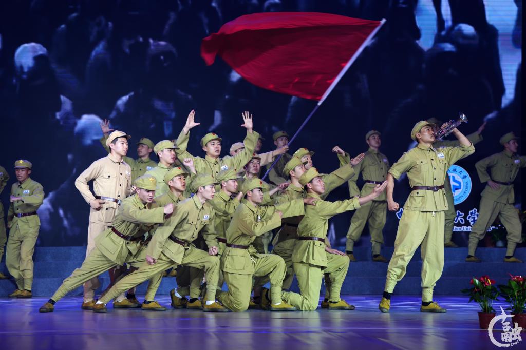 艺术思政大课上篇《奋斗吧!青春》主要用歌舞的形式配以电影大片的混剪视频,艺术化地讲述了百年党史的奋斗历程。情景朗诵《我骄傲,我是中国人》淋漓尽致地展现了新时代十年伟大成就,让每一个身为中国人、民航人的中航大人倍感骄傲、倍感自豪、倍加珍惜。一曲《我爱祖国的蓝天》,用歌声和舞蹈表达了中航大人用青春和汗水全力推动民航科技事业发展,在祖国蓝天上续写辉煌的决心。情景歌曲联唱用四个篇幅连缀起来把建党百年的故事用歌舞、情景表演的方式讲述出来。从1921年建党的伟大时刻,到抗美援朝的青春热血,改革开放的时代脉搏,再到新时代的召唤,囊括了《国际歌》《没有共产党就没有新中国》《中国人民志愿军军歌》《最可爱的人》《我和我的祖国》《如愿》《错位时空》《NEW BOY》8首耳熟能详的歌曲。当“雄赳赳,气昂昂……”的志愿军军歌响起,当影视剧《水门桥》《英雄儿女》《我和我的祖国》《1921》《觉醒年代》的精彩镜头映入眼帘,当李大钊、陈延年、陈乔年、杨根思、邱少云等烈士的镜头出现在背景视频中,观众的眼中噙满了泪水。这些在党的百年奋斗历程中可歌可泣的英雄赞歌激发了全体观众爱国热情,表达了中航大人的家国情怀。