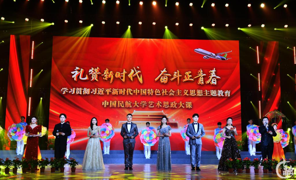 这堂艺术思政大课以回顾党的十八大以来国家、民航、学校取得重大成就的视频短片《礼赞新时代 奋斗正青春》开篇……