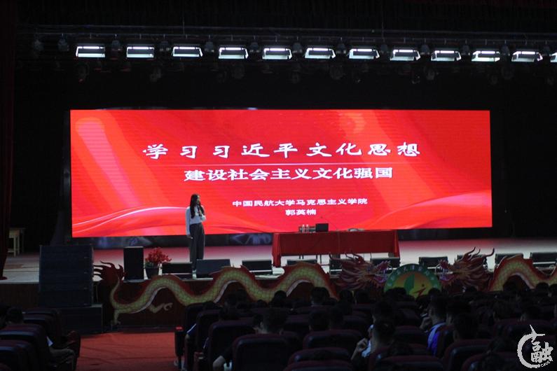 郭英楠在新疆策勒县第一中学大礼堂开展“学习习近平文化思想·建设社会主义文化强国”主题宣讲,策勒县第一中学高一、高二800余名学生代表参与活动。郭英楠以同学们耳熟能详的歌曲作为导入,将同学们的注意力第一时间吸引到课堂,具体内容围绕以下三个方面展开:“为什么说文化是民族生存和发展的重要力量”“新时代全面建设社会主义现代化国家有何战略环境条件”“如何全面建成社会主义现代化强国,铸就社会主义文化新辉煌”其中,在“如何全面建成社会主义现代化强国,铸就社会主义文化新辉煌”这一关键内容上,郭英楠融入民航特色安全文化,从而使学生明确了新时代践行社会主义核心价值观的重要性以及树立文化自信和建设社会主义文化强国的重要意义。
