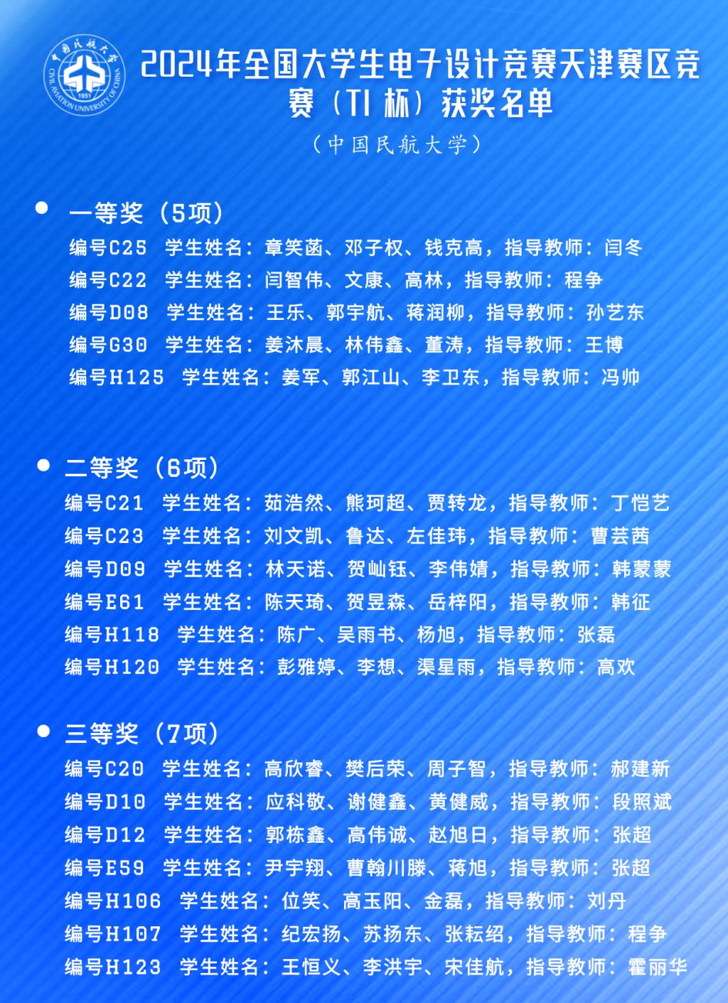 本网讯 近日,2024年全国大学生电子设计竞赛天津赛区(TI杯)暨模拟电子系统设计专题赛落下帷幕。经过四天三夜的努力拼搏,中国民航大学荣获天津市一等奖5项、二等奖6项、三等奖7项,一等奖数量位列天津市各高校第一名。同时,经天津赛区评测专家组研究决定,推荐学校编号C25的队伍作为天津赛区唯一一支选拔队伍,参加模拟电子系统设计专题赛决赛。