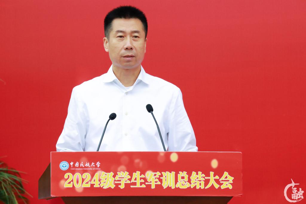 曹胜利在讲话中指出,军训是大学的第一课,也是成长的第一关。同学们经受住了体力与耐力的双重考验,展现出新时代中航大学子良好的精神面貌、顽强的意志品质和过硬的纪律作风。全面展示了军训取得的优异成绩,交上了大学阶段第一份合格答卷。军训工作的圆满完成,离不开全体承训教官、学工干部、学生教官和后勤服务保障人员的辛勤付出。军训生活的结束,意味着大学生活新的征程的开启。同学们是新时代的见证者、经历者,也是新时代的参与者、奋斗者,更是新时代的建设者、开创者,希望同学们传承红色基因,追逐蓝色梦想,铸就金色辉煌,立报国强国大志向,做挺膺担当奋斗者,以青春之笔奋力书写不负于韶华、无愧于时代的美好人生,以满腔热情和实际行动,为交通强国建设民航新篇章,为以中国式现代化全面推进强国建设、民族复兴伟业,贡献自己的青春、智慧和力量。
