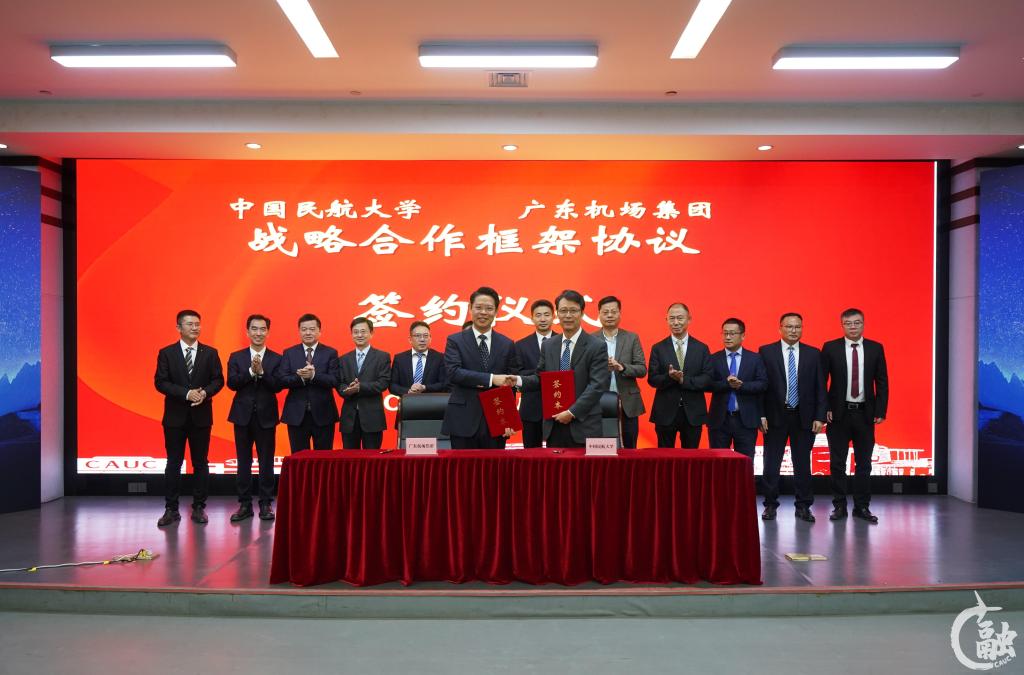 会上,杨新湦与曲朝代表双方共同签署中国民航大学—广东省机场管理集团有限公司战略合作框架协议。中国民航大学卓越国际学院领导与广东机场管理集团有限公司人力资源部领导代表双方为中国民航大学卓越国际学院(广东)分院揭牌。