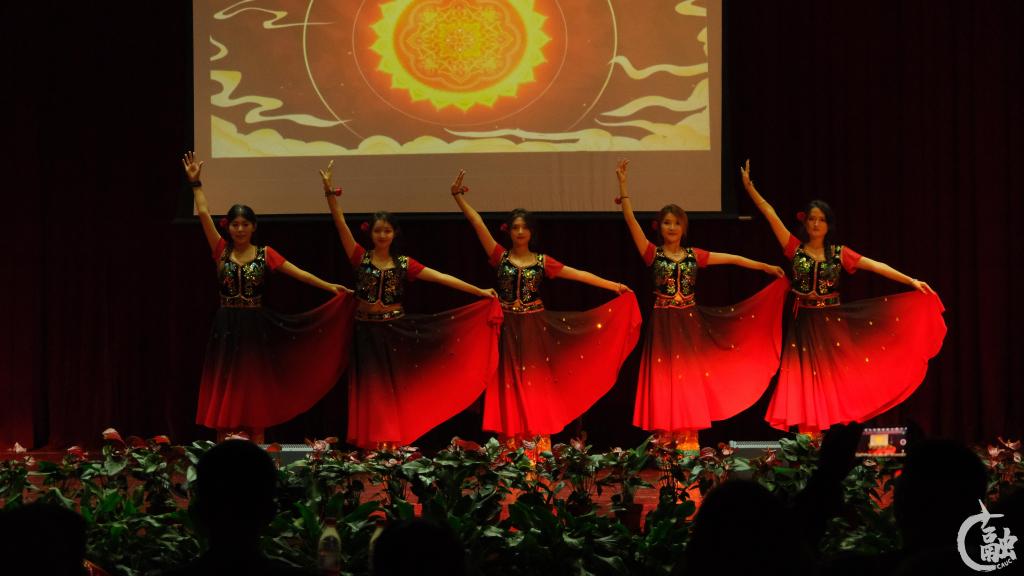 石榴花绽放,石榴籽紧抱。节目展演环节,各民族同学的风采随着开场曲民乐演奏《兰亭序》在舞台上徐徐盛开;蒙古族独舞《狼》挺拔豪迈的舞姿与轻捷洒脱的步伐带领观众穿梭于广袤草原;维吾尔族群舞《梦回新疆》则让观众心驰神往于神秘的西域风情;歌曲《至少还有你》如一缕清风拂过心田,给人带来温暖与感动;藏族群舞《黑颈鹤》自由而深邃,展示雪域高原的风华;创意群舞《茶香舞韵》融合了少数民族舞蹈与街舞,赢得满堂喝彩;现代舞《Revo jazz crew》与中华传统民族服装国风走秀《锦绣华章·古韵悠长》更是将现场气氛推向高潮,展现青春活力与历史沉淀的碰撞;古典舞《爱莲说》诠释莲花的高洁之美;民族舞《葡萄架下的篝火》展示维吾尔族、塔塔尔族、塔吉克族以及俄罗斯族的舞蹈艺术,彰显中华民族的多元与包容。