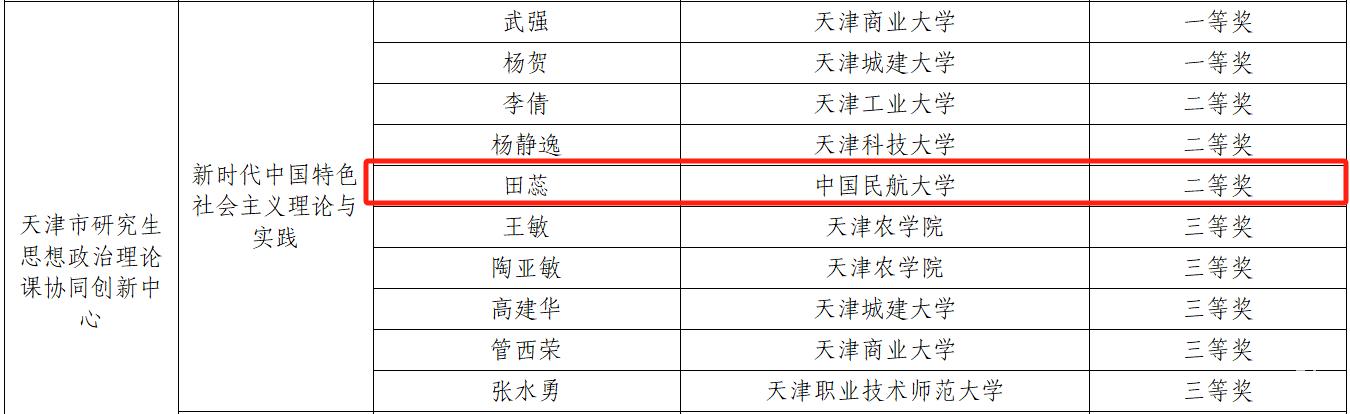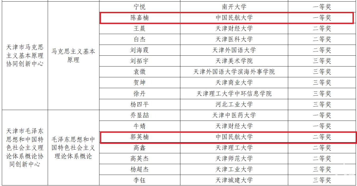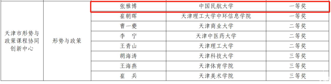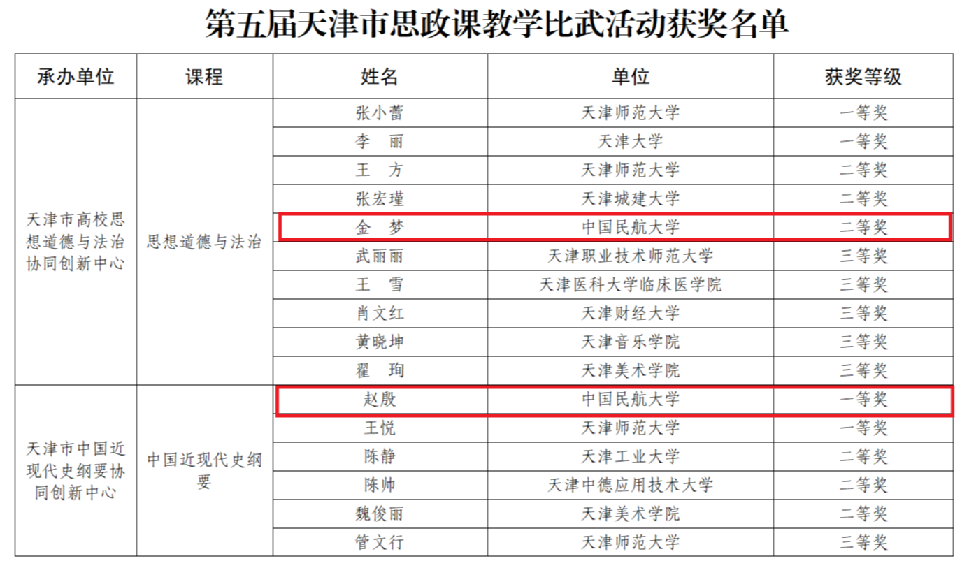 本网讯 近日,天津市教委、市教育工委公布第五届天津市思政课教学比武活动获奖名单,中国民航大学6名思政课教师获得一、二等奖。其中,3名教师在《中国近现代史纲要》《马克思主义基本原理》《形势与政策》课程教学比武中荣获一等奖,3名教师在《思想道德与法治》《毛泽东思想和中国特色社会主义理论体系概论》《新时代中国特色社会主义理论与实践》课程教学比武中荣获二等奖。