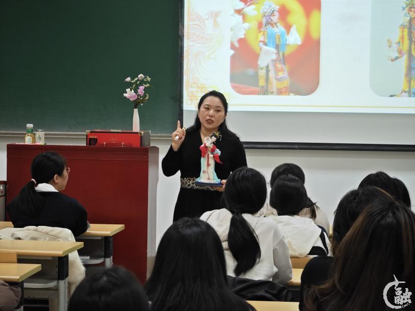 任伟以“什么是非遗”向学生们发问,通过举例介绍、互动等方式,介绍“非遗”的概念。用剪纸、窗花、二十四节气等身边的例子告诉学生们“非遗”就在身边。通过改变手中绢人的姿态,任伟直观地介绍“三维立体软变形工艺”,学生们被这款独特的“芭比娃娃”能自如活动的特征所吸引。