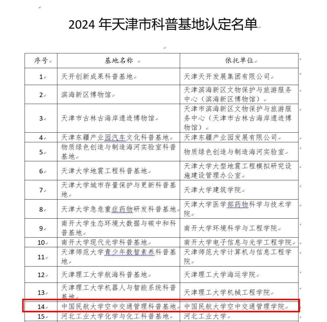本网讯 近日,天津市科学技术局公布2024年天津市科普基地认定结果。市科技局、市教委、市科协经过材料评审、会议答辩、实地勘察等程序,中国民航大学空中交通管理科普基地获评天津市科普基地。