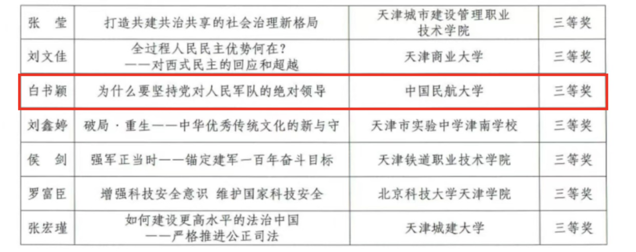 2024年天津市学校思政课教师磨课练兵活动旨在深入学习贯彻全国教育大会精神和习近平总书记关于思政课建设重要指示批示精神,提升思政课教师教学水平,经过征集报名、组织遴选、磨课展示、专家评审等环节,共评出15项优秀示范课。在前期征集报名中,张雅博、白书颖从全市50所高校、158名高校教师中脱颖而出,成功进入全市32人磨课大名单,经过大中小思政课教师集中磨课展示,最终进入决赛并取得优秀示范课一等奖、三等奖的好成绩。