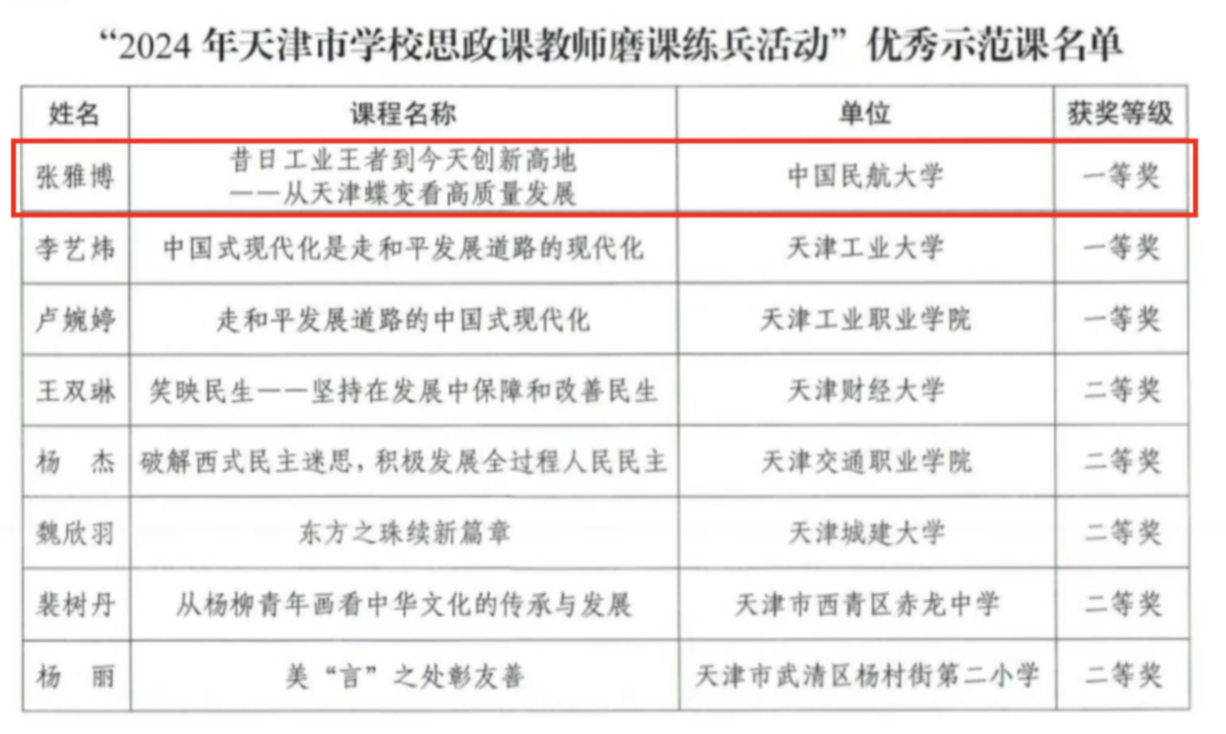 本网讯 近日,天津市教育工委、市教委公布“2024年天津市学校思政课教师磨课练兵活动”优秀示范课评选结果,中国民航大学马克思主义学院青年教师张雅博、白书颖分别主讲的“昔日工业王者到今天创新高地——从天津蝶变看高质量发展”(一等奖)和“为什么要坚持党对人民军队的绝对领导”(三等奖)荣获优秀示范课。