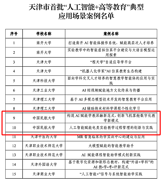本网讯 近日,天津市教委公布了首批“人工智能+高等教育”典型应用场景案例,中国民航大学组织乘务学院申报的“构筑AI赋能学教深融新范式,创新飞机客舱数字化教学新模式”、电子信息与自动化学院申报的“人工智能赋能电类实验教学过程管理的创新与实践”两个案例成功入选,标志着学校在人工智能与本科教育融合的道路上迈出坚实的步伐。