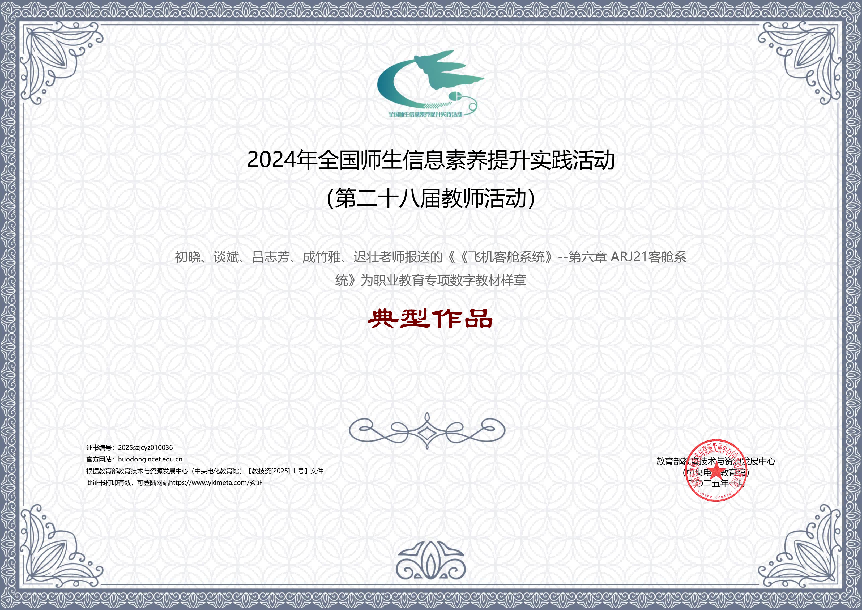 乘务学院飞机客舱系统教学团队立足数字化教育新生态,着力打造“人工智能+”智慧教育平台,形成了以数字技术为支撑,以数字文化为底蕴的教学体系。该模式结合主流机型和教学设备设施,满足民航院校相关专业飞机客舱系统课程教学实施的需求,同时还有助于培养学生的逻辑思维和科技素养,激发学生的学习兴趣和探索精神,促进学生的全面发展。同时课程建设过程中获得了2024年全国师生信息素养提升实践活动典型作品及软件著作权等成果。
