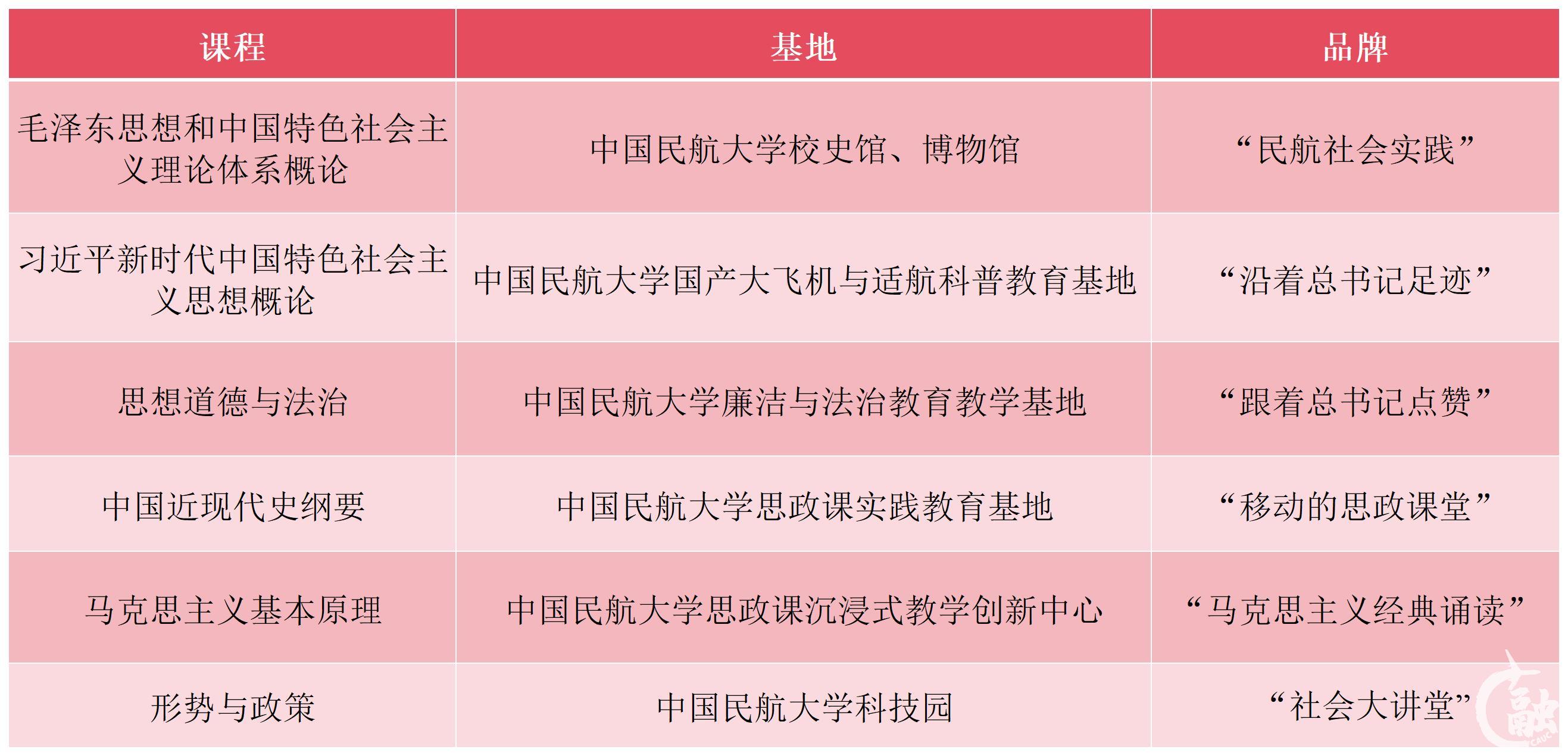 开展思政课实践教学,形成“一课程一基地一品牌”建设格局。基地建成后,学校已经自有7个红色文化实践基地和育人场馆,形成了“两馆”(中国民航大学校史馆和博物馆)“三基地”(中国民航大学廉洁与法治教育教学基地、中国民航大学国产大飞机与适航科普教育基地、中国民航大学思政课实践教育基地)“一中心”(中国民航大学思政课沉浸式教学创新中心)“一园区”(中国民航大学科技园)育人基地平台。马克思主义学院根据六门本科思政课必修课程教学要求,充分利用6个基地,有序开展实践教学,已探索形成“一课程一基地一品牌”建设格局。
