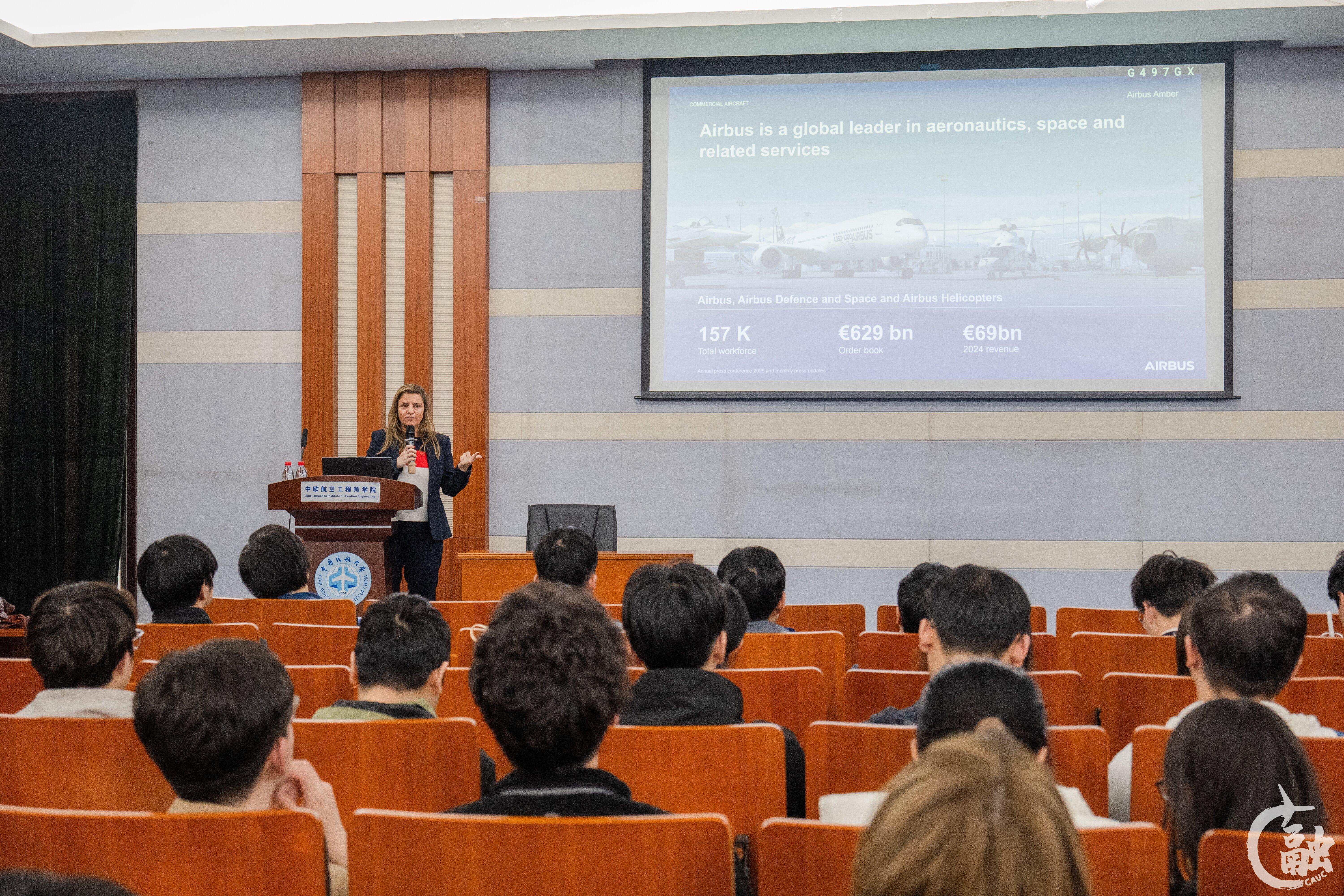 本网讯 近日,国际处(港澳台办)和中欧航空工程师学院在北24教学楼报告厅共同举办第五期“全球视野·航向未来”讲座。空中客车数字化国际负责人桑德拉·德·卢卡斯(Sandra DE LUCAS)女士团队作“航空业对工程师和数字化人才的需求”主题报告。