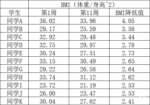 今年是《运动减脂课》开课的第二年,这门课程主要针对学校超重和肥胖(即身体质量指数BMI≥24)的学生,通过专业的膳食营养与运动减脂知识和技能方面的讲授,帮助他们减重并塑造更加健康的体格。课程截至目前,班级1/2以上同学的BMI下降超过2.00,单人减重最多5.5公斤,单人减脂最多6.7公斤,近1/3的学生在体测BMI一项的测试中取得满分。