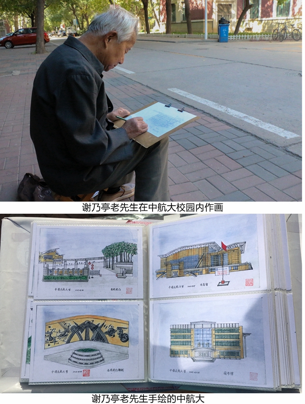 谢乃亭从初中就对美术产生了浓厚的兴趣,高中加入美研社,就业后工作的工厂也从事美术宣传,退休后更是继续执笔。家住小海地的他距离学校有1个多小时的车程,当记者问及为何要来离家如此远的中航大为其作画时,谢乃亭开心地表示天津市区的高楼大厦都大同小异,画出来也没有意义,但是大学却不一样,每个学校都各具特色,特别是中航大,它有特色的南北两个校区,还有独一无二的停机坪,中航大有悠久的历史,先进的教学设备,庞大的藏书量……这些深深吸引着他。