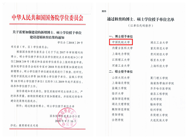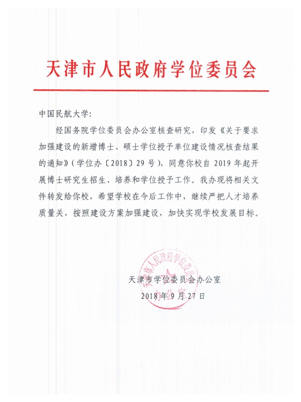 本网讯 9月27日,天津市学位委员会办公室正式致函中国民航大学:经国务院学位委员会核查研究,印发《关于需要加强建设的新增博士、硕士学位授予单位建设进展核查结果的通知》(学位办[2018]29号),同意中国民航大学自2019年起开展博士研究生招生、培养和学位授予工作。