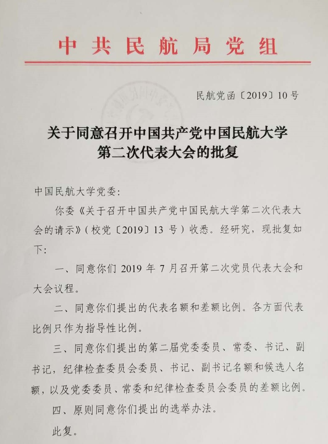 本网讯 经中国共产党中国民航大学第一届委员会第十四次全体会议表决,并报请民航局党组批复同意,中国共产党中国民航大学第二次代表大会将于2019年7月召开。日前,中国共产党中国民航大学委员会印发《关于做好中国共产党中国民航大学第二次代表大会筹备工作的通知》。