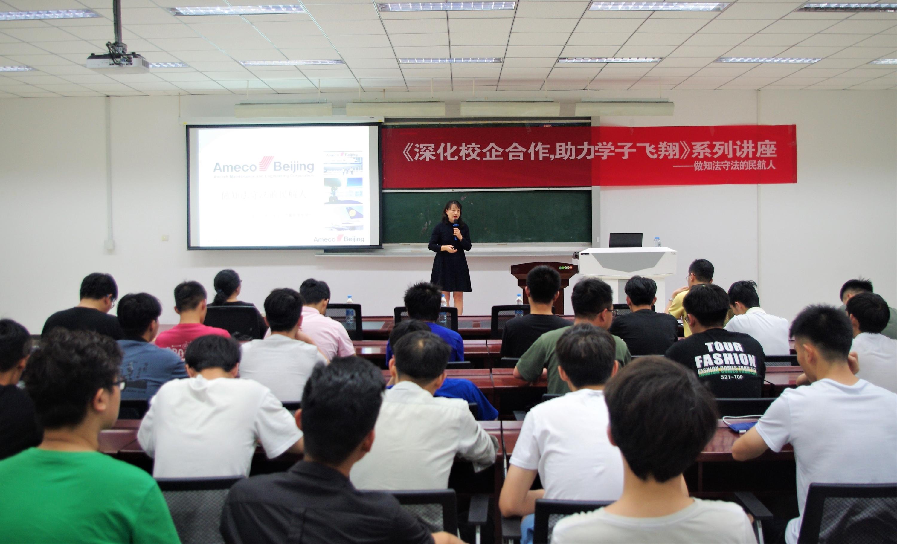 本网讯 日前,中国民航大学优秀校友、北京飞机维修工程有限公司(AMECO)航空安全与质量管理部副总经理杨阳作客“蓝天工匠讲堂”,以《深化校企合作 助力学子飞翔——做知法守法的民航人》为题,与300余名机务专业师生展开交流。