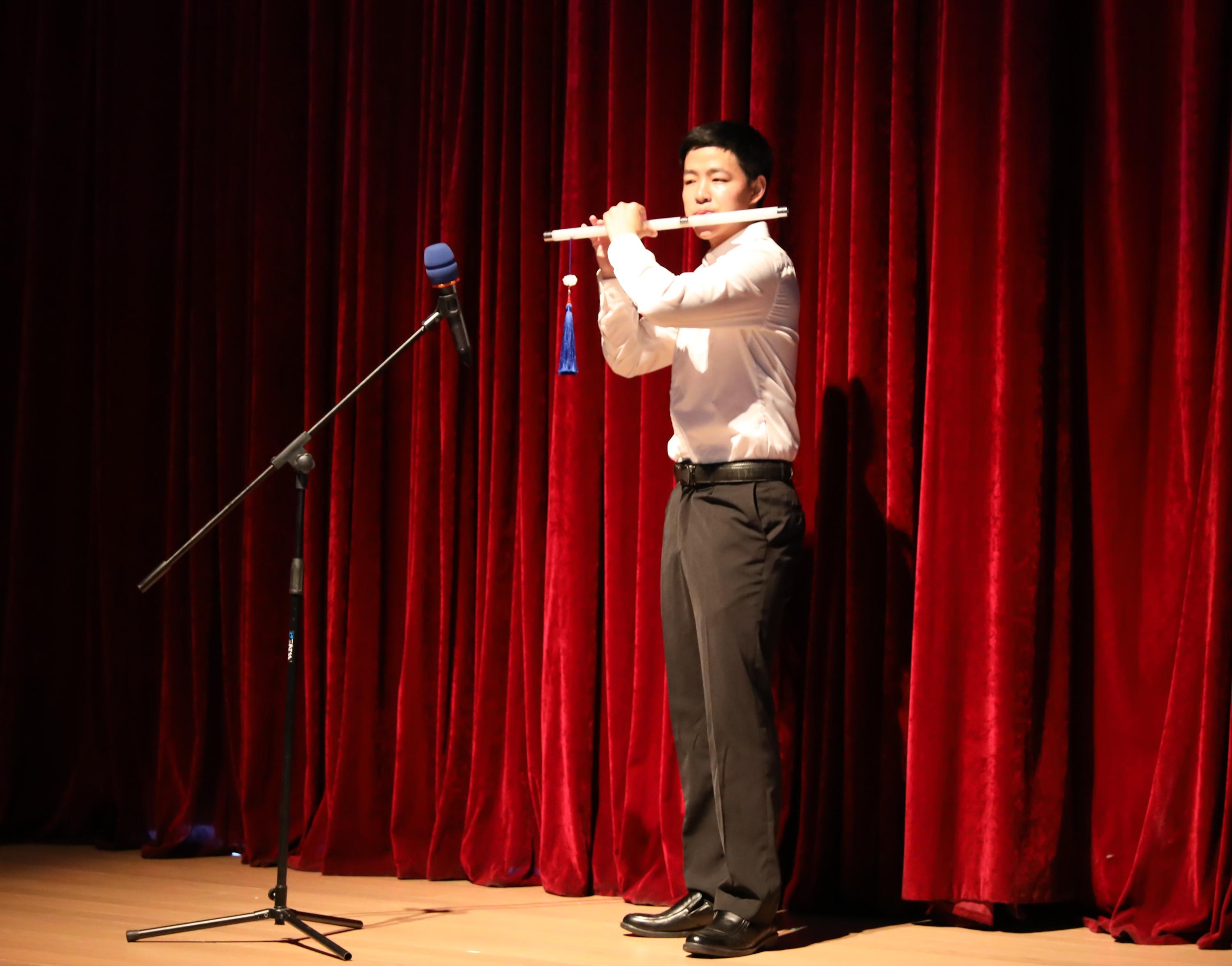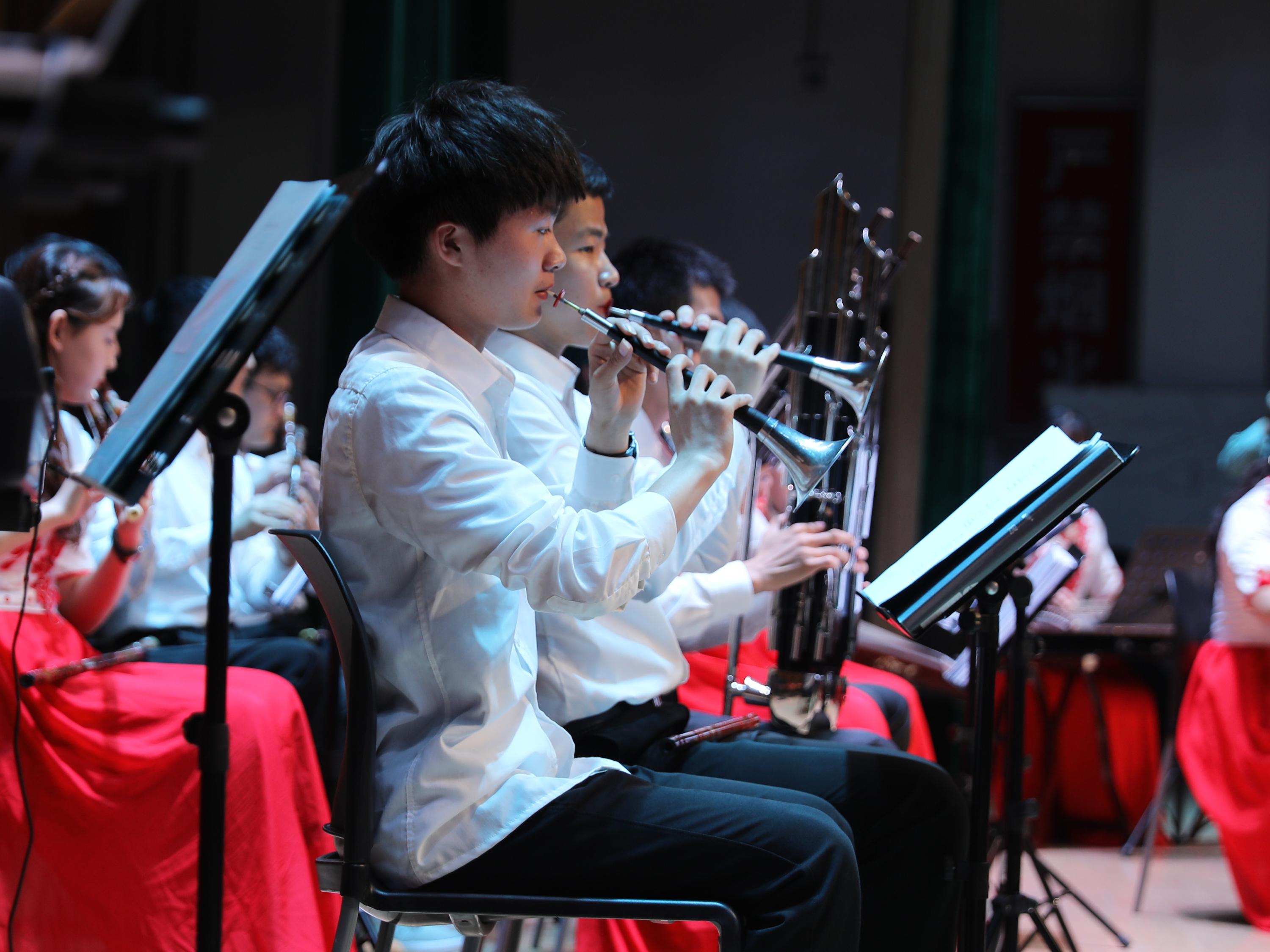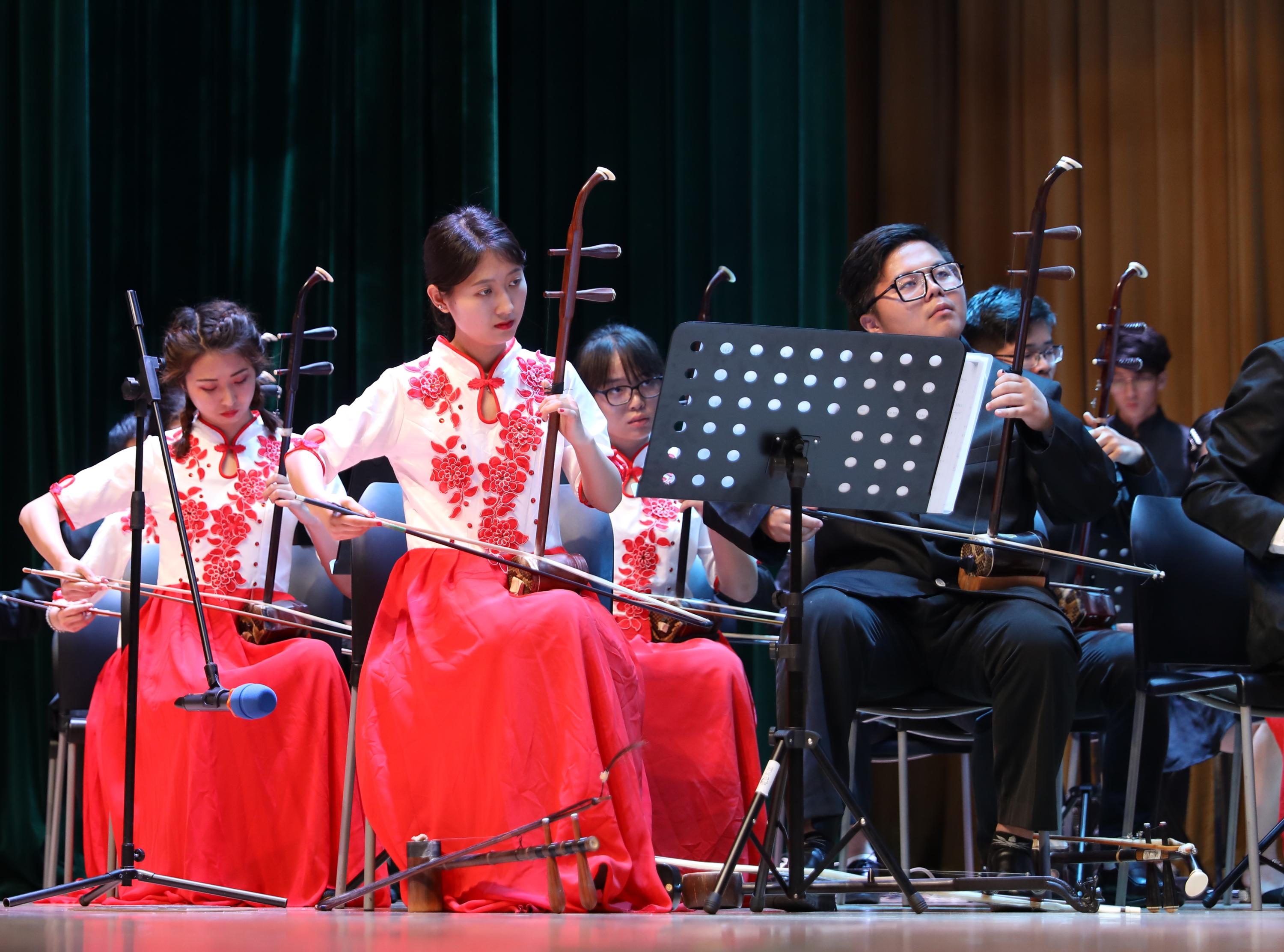 民乐团由弓弦声部、弹拨声部、打击声部等七大声部组成,包括高胡、葫芦丝、唢呐、笙、琵琶、扬琴、五音排鼓等20余种民乐特色乐器。开场曲《喜洋洋》以笛子二声部的重叠、顿音和加花的手法和木鱼清脆的节奏相衬托,使整首曲子节奏欢快轻松;民族管弦乐《庆典序曲》以热烈快速的跑句和唢呐、锣鼓的齐鸣,勾勒出节日庆典的画面;活泼跳动的竹笛独奏《牧民新歌》仿佛将全体同学带入了生机勃勃的内蒙古大草原;弓弦重奏《战马奔腾》是由二胡奏出的铿锵有力的军歌乐曲,在观众们眼前重现了硝烟滚滚、将士挥戈、万马奔腾的战场画面;古筝重奏《克罗地亚狂想曲》营造了浓浓的异域风情,展现了民乐不一样的演奏风格;民乐小合奏《北京一夜》则别具一格地加入了京剧唱腔,为在场听众带来了别样的体验;乐曲《鸿雁》更是将流行和民族元素完美结合,将晚会推向了高潮;演出在民族管弦乐《金蛇狂舞》和《花好月圆》欢快的节奏中落下帷幕。现场观众沉浸在民乐的世界中,掌声不断。