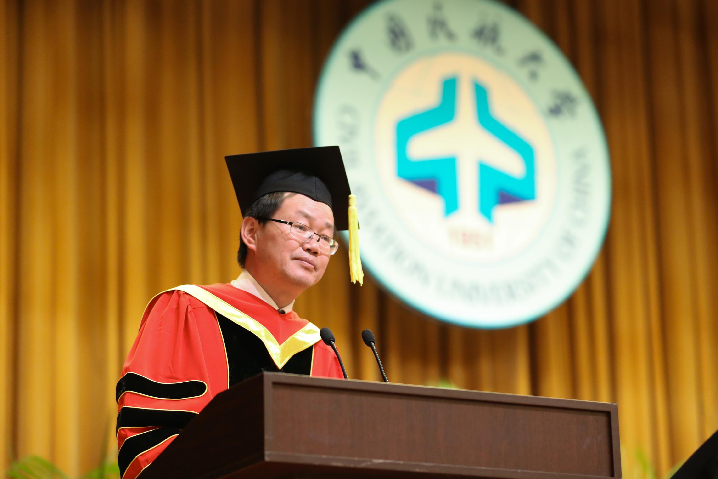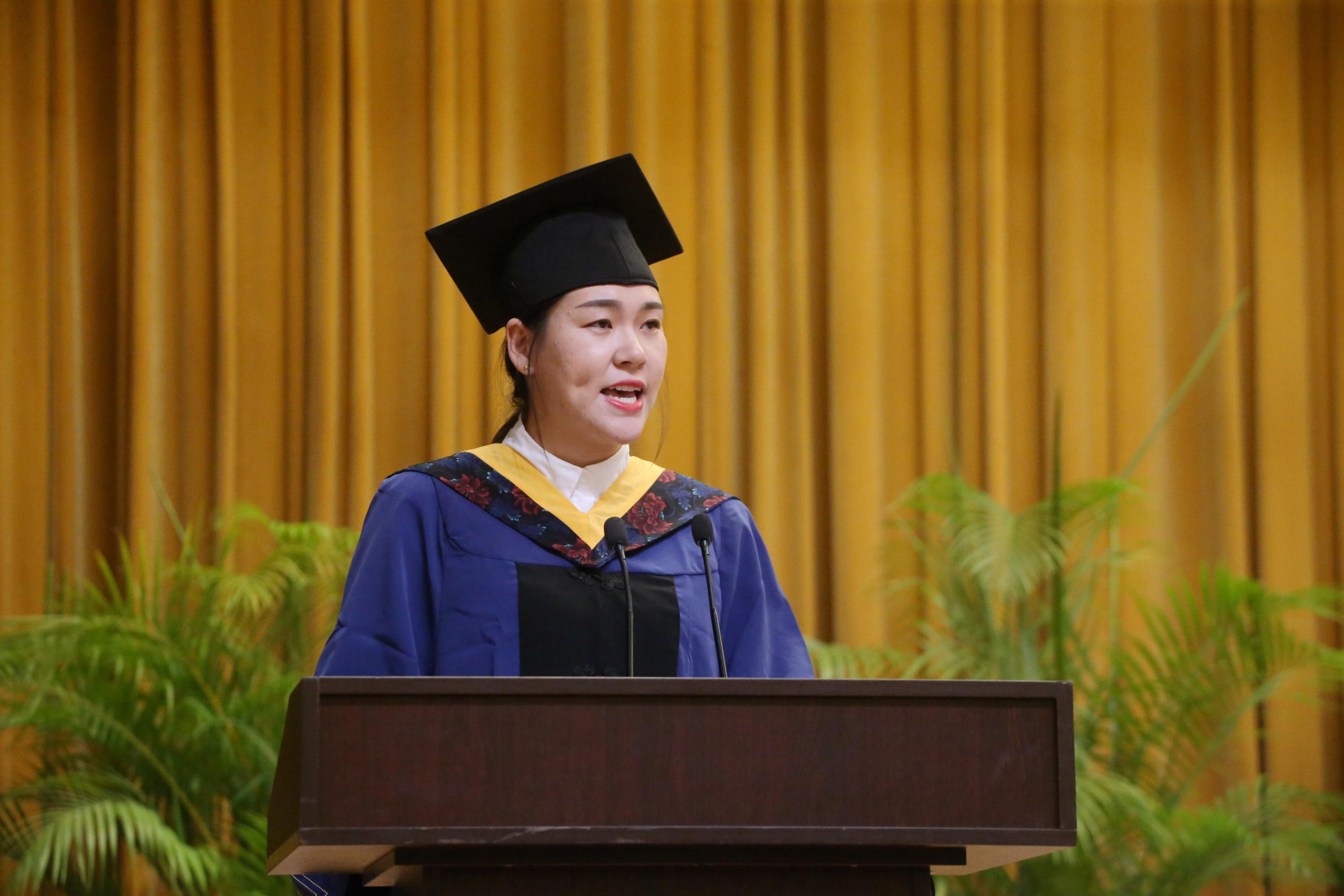 硕士研究生毕业生代表王颖发言。她感谢芳华正茂的中航大为大家创造良好学习环境,感谢老师们的谆谆教导和家人们不求回报的付出。三年的学习生涯将中航大“严实、向上”的校风印在心里,将“笃学、精博、严谨、创新”的学风刻在脑海。她代表毕业生立下铮铮誓言:青春与民航结缘,从此将践行当代民航精神,用自己专业之所学为民航安全生产保驾护航,在工作岗位上发光发热,坚守初心,不负韶华。