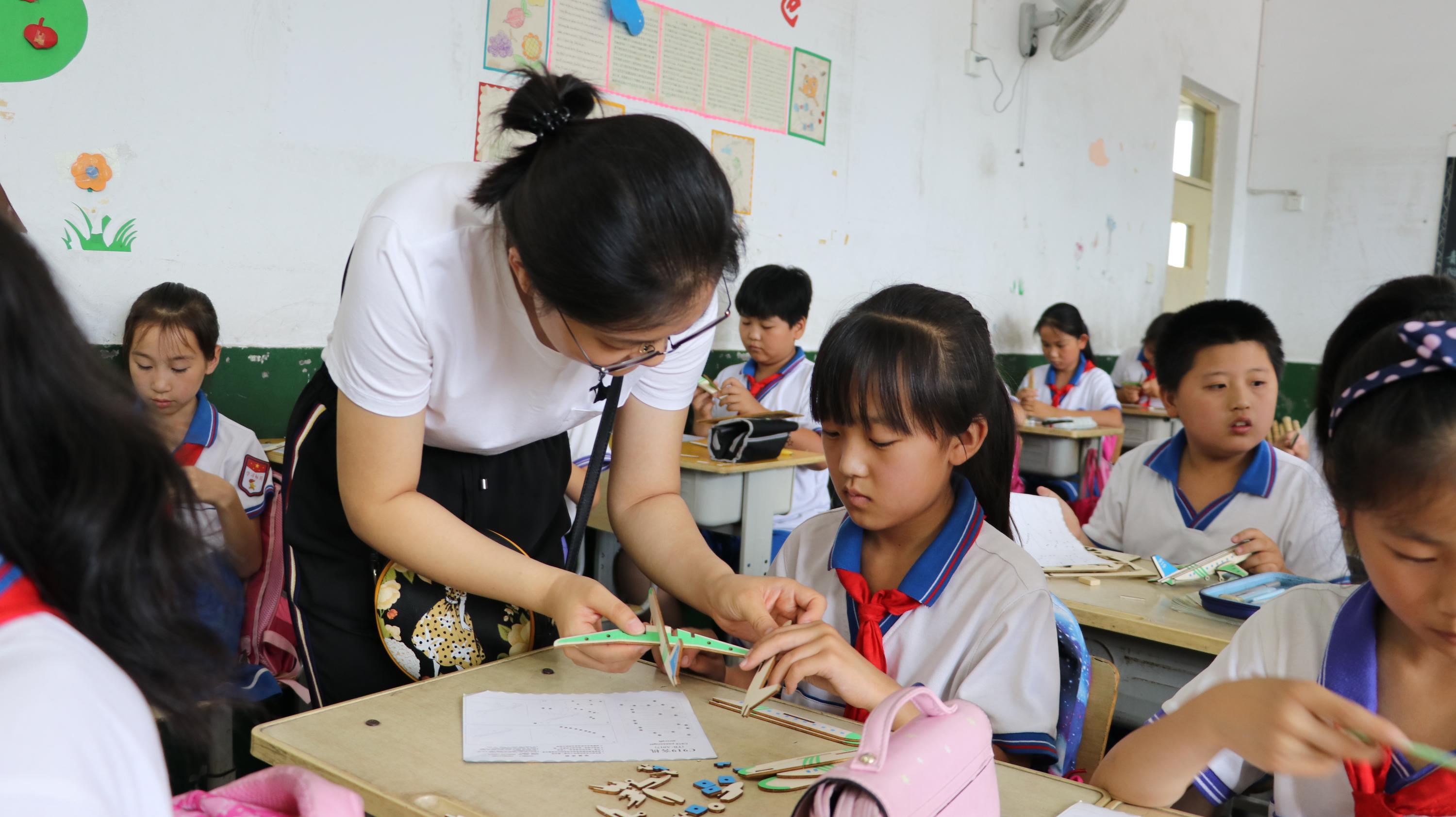 实践队员帮助小朋友组装飞机模型