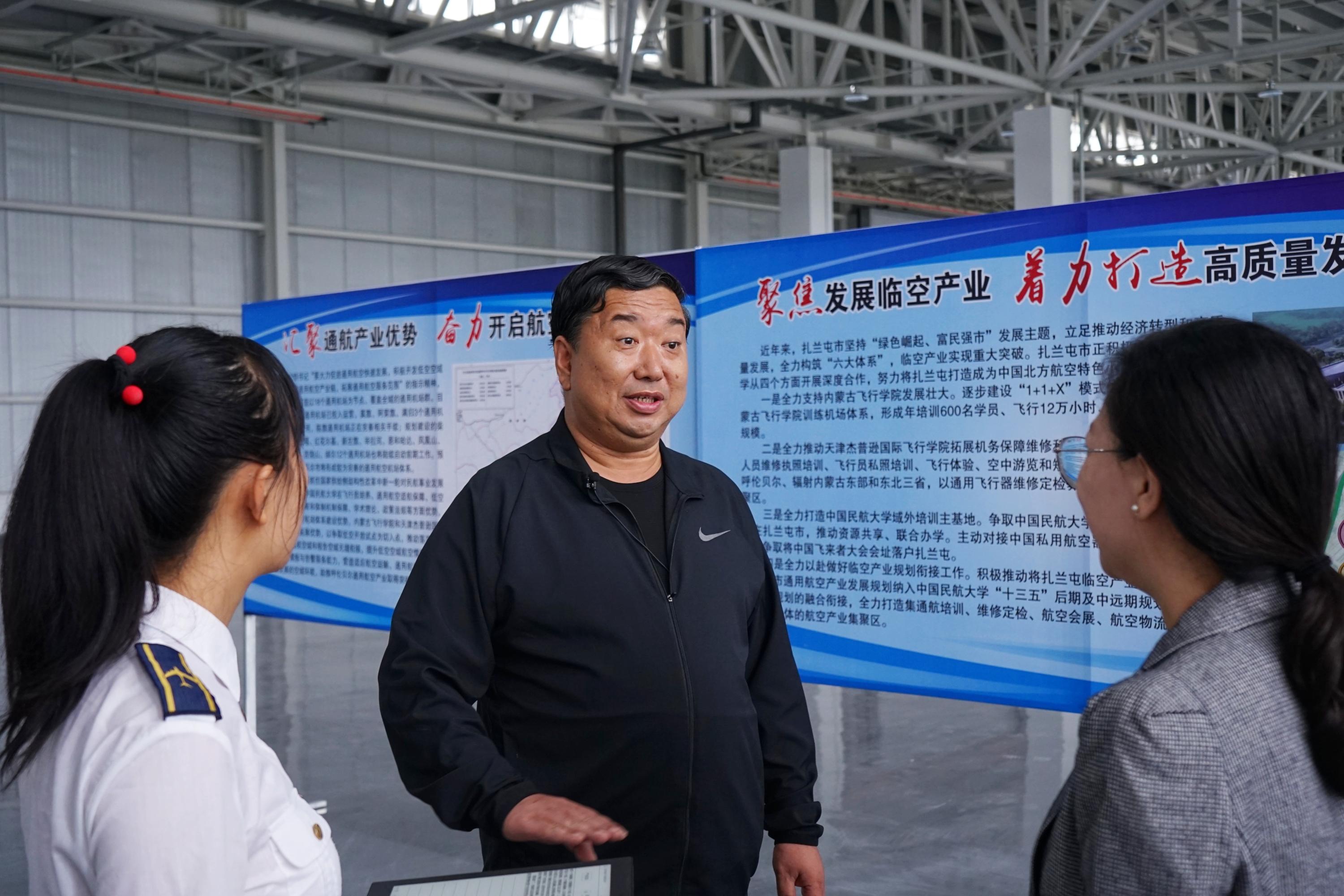 在扎兰屯市民航事业发展管理中心主任李伟的陪同讲解下,市委常委办公室主任殷宪,扎兰屯市副市长孙修非,中国民航大学内蒙古飞行学院综合部季可心与实践队一行参观了位于扎兰屯市成吉思汗机场的内蒙古飞行学院实训基地,包括实训综合楼、飞行准备室、机库、停机坪、联络道等基础设施。