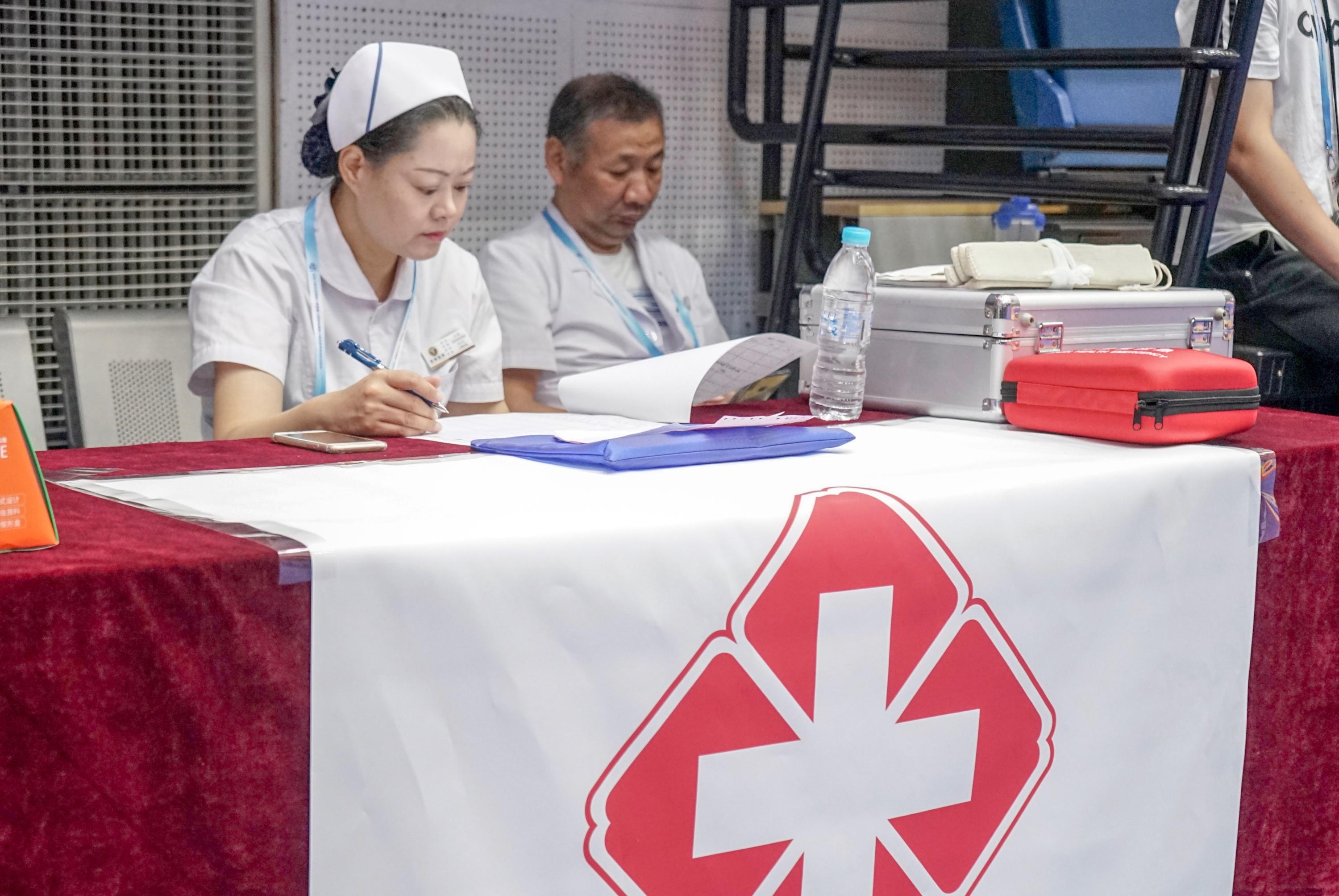 除了礼仪志愿者,赛场上还有很多不易被人看到却默默为比赛的顺利进行贡献力量的志愿者们。在赛场的一个角落里,医疗救护志愿者宋挺7:40就到达了赛场的医疗救护点,他一刻也不放松地关注着赛场上的情况,“作为医疗救护志愿者,我们一定程度上承担着守卫运动员、教练员、嘉宾以及现场工作人员人身安全的责任,我知道这份责任的重量因此一刻也不敢放松。当现场出现突发情况需要医疗救助时,我们一定会第一时间出现。”