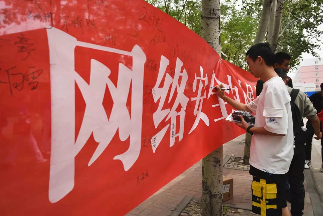 学生们在“网络安全为人民 网络安全靠人民”横幅上签名