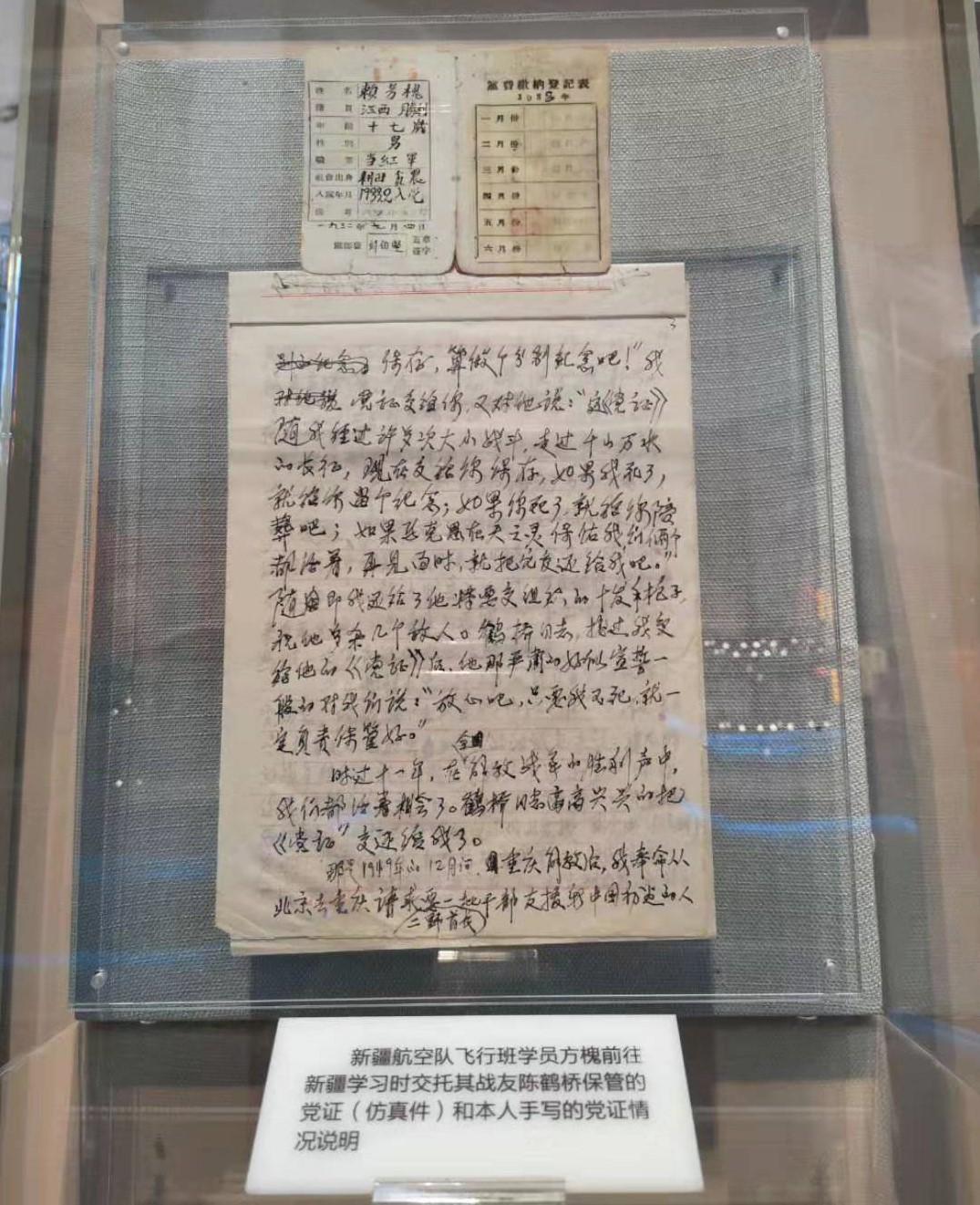本网讯 日前,庆祝空军成立70周年主题展览在北京昌平的中国航空博物馆开展。学校档案馆选送的2件实物档案展品:方槐党证(仿真件)、本人回忆记录手迹(原件)在“蓝天铸忠诚”展区展出,吸引众多军内参观者驻足观看。