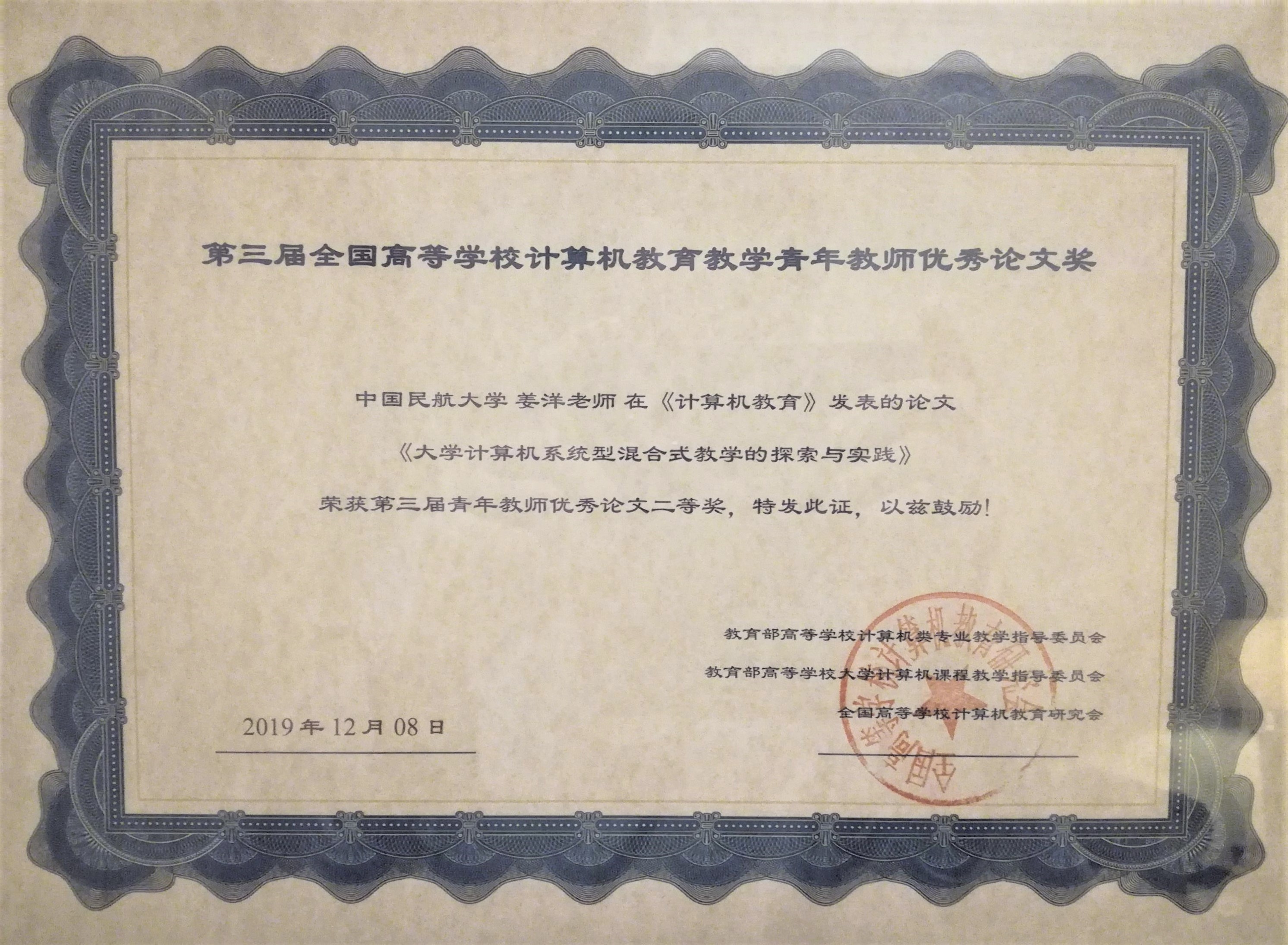 本网讯 12月7日至8日,以“新时代、新计算、新教育”为主题的2019中国计算机教育大会(CECC2019)在厦门召开,会上揭晓第三届全国高等学校计算机教育教学青年教师优秀论文奖,中国民航大学计算机学院教师姜洋的论文《大学计算机系统型混合式教学的探索与实践》获得青年教师优秀论文二等奖。