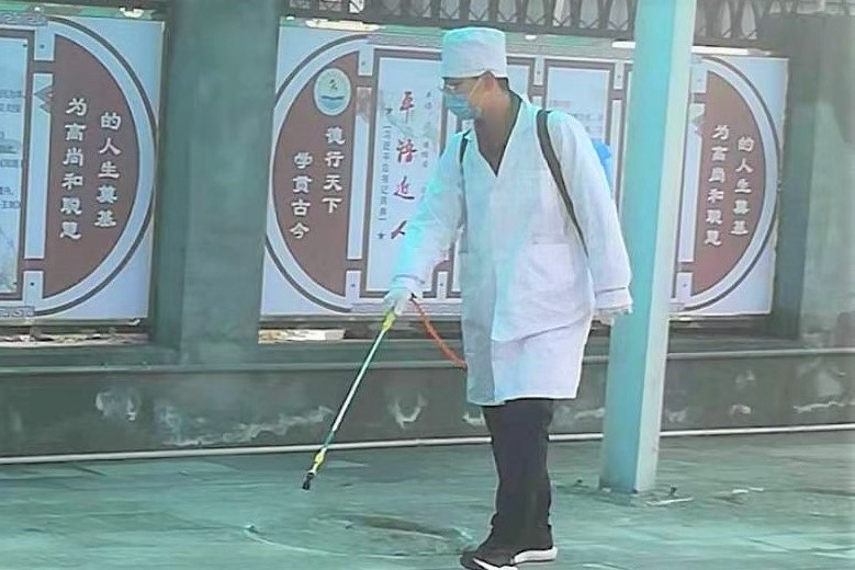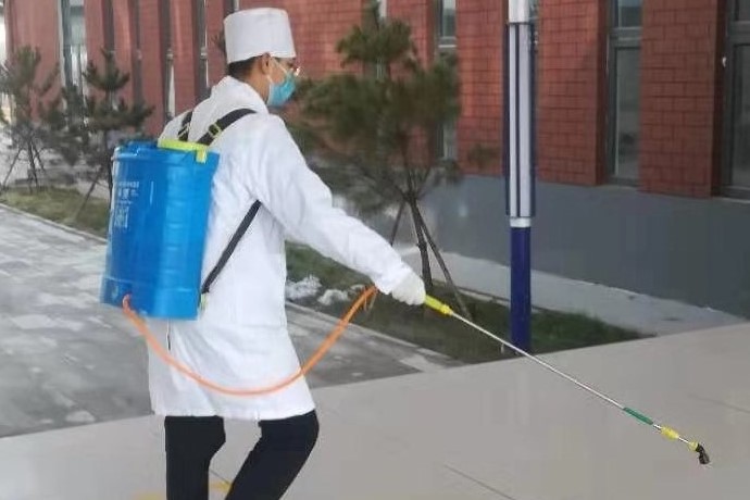 为做好防疫工作,王金宁所在的社区每周都会进行消毒,保证社区的公共卫生安全。王金宁穿着统一的工作服——白大褂,戴着防护帽、护目镜、口罩和手套,背着消毒液药桶,在社区的各个角落喷洒消毒液。
