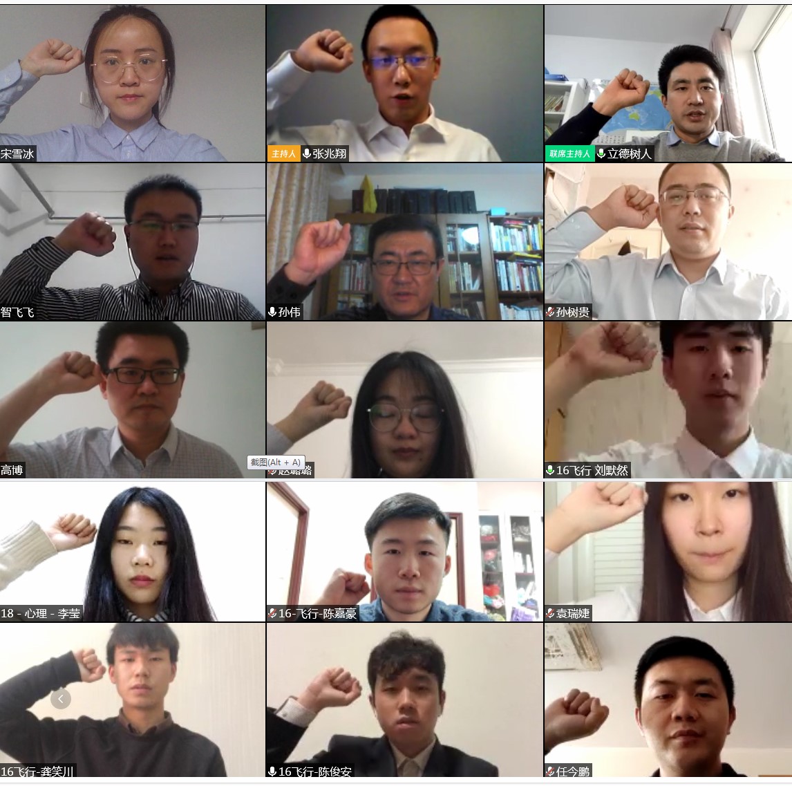 本网讯 2月25日,中国民航大学飞行技术学院召开在鄂学生临时党支部成立大会暨“凝心聚力战疫情·共克时艰担使命”线上主题党日活动,充分发挥学生党员在湖北战“疫”一线的先锋模范作用,做好在鄂学生防疫与在线课程工作,把组织的红色堡垒挺在最前线,让党旗在疫情防控第一线高高飘扬。