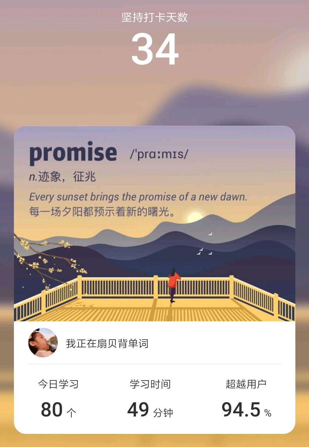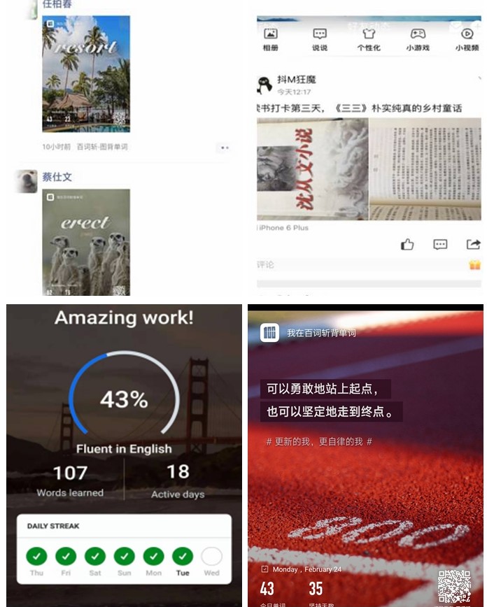 在“扇贝”背单词软件上打卡背单词的气氛十分活跃,职业技术学院2018级学生刘瑞英是众多打卡者之一,她说:“目前为止,我在扇贝单词上打卡已经一个多月了,每天坚持背80个单词。希望能够提升自己的英语水平,坚持下来发现,每天不用闹钟提醒也会主动学习,希望自己可以一直坚持下去。”