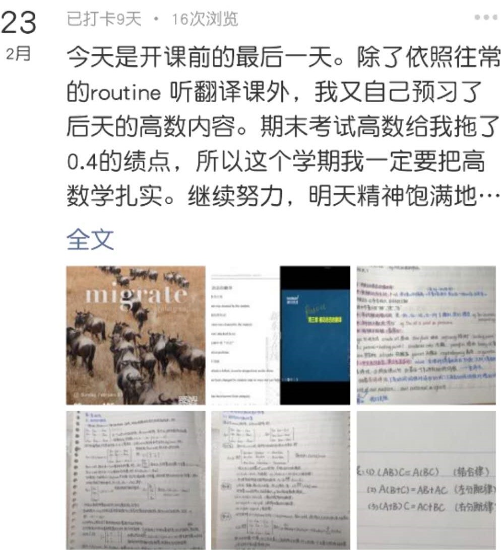 近日,只要打开微信打卡小程序和朋友圈或其他动态分享软件,都会看到中航大学子在假期坚持打卡的动态。他们每天都会以发视频或图片的方式在各个平台上陆续打卡,打卡内容包括当天学习的知识、运动锻炼的项目、兴趣爱好的学习成果、坚持学习的时长等。