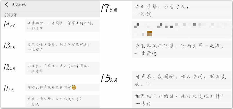 每日遨游于诗词的浩瀚海洋,在朋友圈分享诗词学习的外国语学院2018级学生林洪旭在假期多了学习和欣赏诗词的时间,他说:“诗词不同于小说,诗词聊聊数十字便能够表达出多种情感,这是种美的艺术,同时也是效率的技术。品味诗词有着潜移默化的影响。我一开始并没有掌握欣赏诗词的方法,只是单纯读懂其中的典故典例。但现在我才懂得抛去诗词中词藻修饰,那些用简简单单几字便抒发得淋漓尽致的情感才是诗词真正的精华。我们应当尊重和传承这些经过时间洗礼的诗词文化。”
