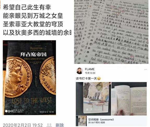 外国语学院2019级学生张思真在寒假时一直坚持学习打卡,她分享了自己的寒假学习计划:“在家里进行学习活动。首先,我确定了学习目标:学习日语基础、翻译入门、预习下学期的内容。定好目标后我开始在各个平台上寻找学习资源:沪江网校的日语五十音教学,新东方的翻译基础课等等。然后,我会在前一天晚上写好第二天的任务,并按照计划一项一项完成。现在学校的在线课程已经开课,但是我的课外学习不会停止,我会坚持每天抽出时间进行单词打卡和课程学习。”她认为,学习一定是个人的事情,尽早确定目标是十分重要的,同时学习也是一个长久的过程,在假期和疫情期间也不能放松。“我在刚上大学时就确定了考研的目标,所以在学好专业课的同时,也开始在网上搜集各种关于考研的信息。俗话说,良好的开端是成功的一半。我相信,在大一打好基础,养成良好的学习习惯,将来就会有更多的机会靠近自己的梦想。”