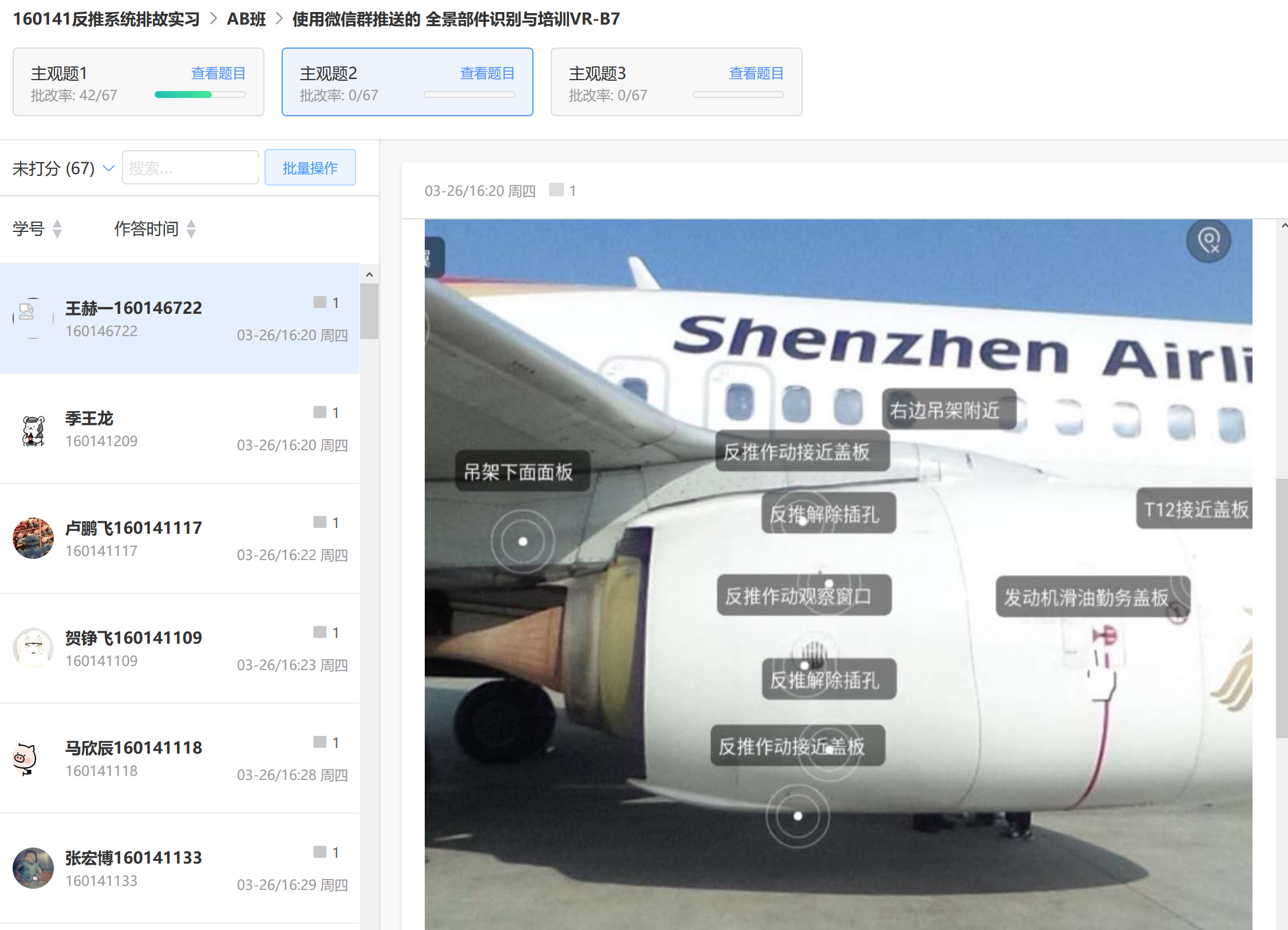 设计标准教学环节,让FIM故障隔离程序可视化。为了让学生获得标准化的维修训练,杨军充分利用网络上的B737NG全景部件与识别VR系统,让学生在虚拟飞机上找到反推相关的部件并截图上传代替实验室设备。对于反推系统故障检测、故障保留和故障隔离等维修工作,杨军以波音公司出品的反推排故教学视频为蓝本,设计了测试题,让学生通过观看视频和查询手册,制订故障隔离流程图,深入理解每项维修工作的实际意义。