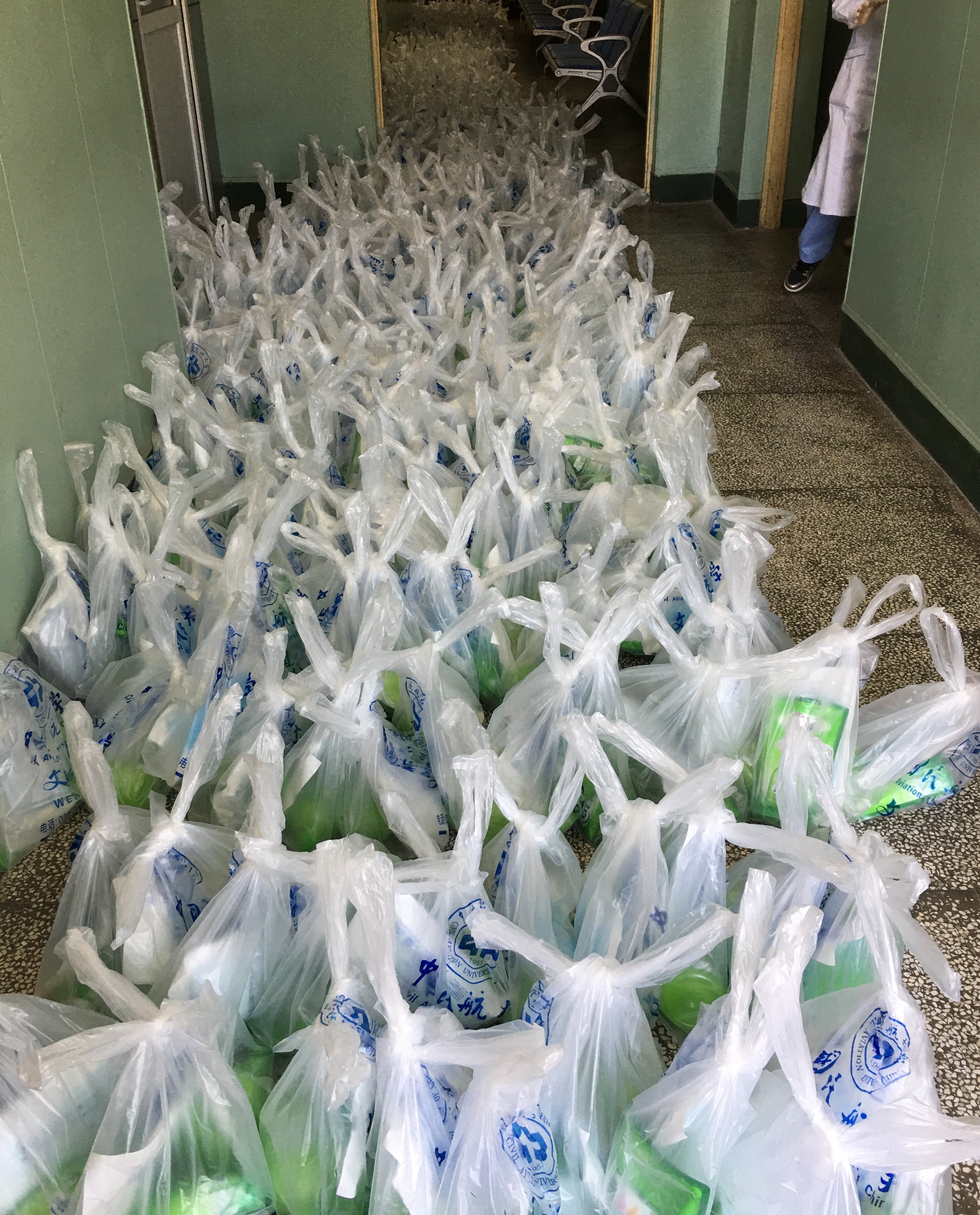 最早的一次是3月14日,校医院值班人员集中为校离退职工667人发放了一次防疫物资,每人发了10只一次性医用外科口罩、一瓶洗手液和一袋洗衣液。校医院还为民航大学在国外的学生、教师和国内外的外教发放了4次防疫物资,包括口罩、护目镜和酒精擦片等。规模最大的一次是3月31日至4月1日,校医院为全校教职工3445人,发放口罩、消毒液和洗手液,这次接收物资的不仅有校本部的单位,还包括外地的朝阳飞院、内蒙古飞院、新疆天翔飞行学院和杰普逊学院。