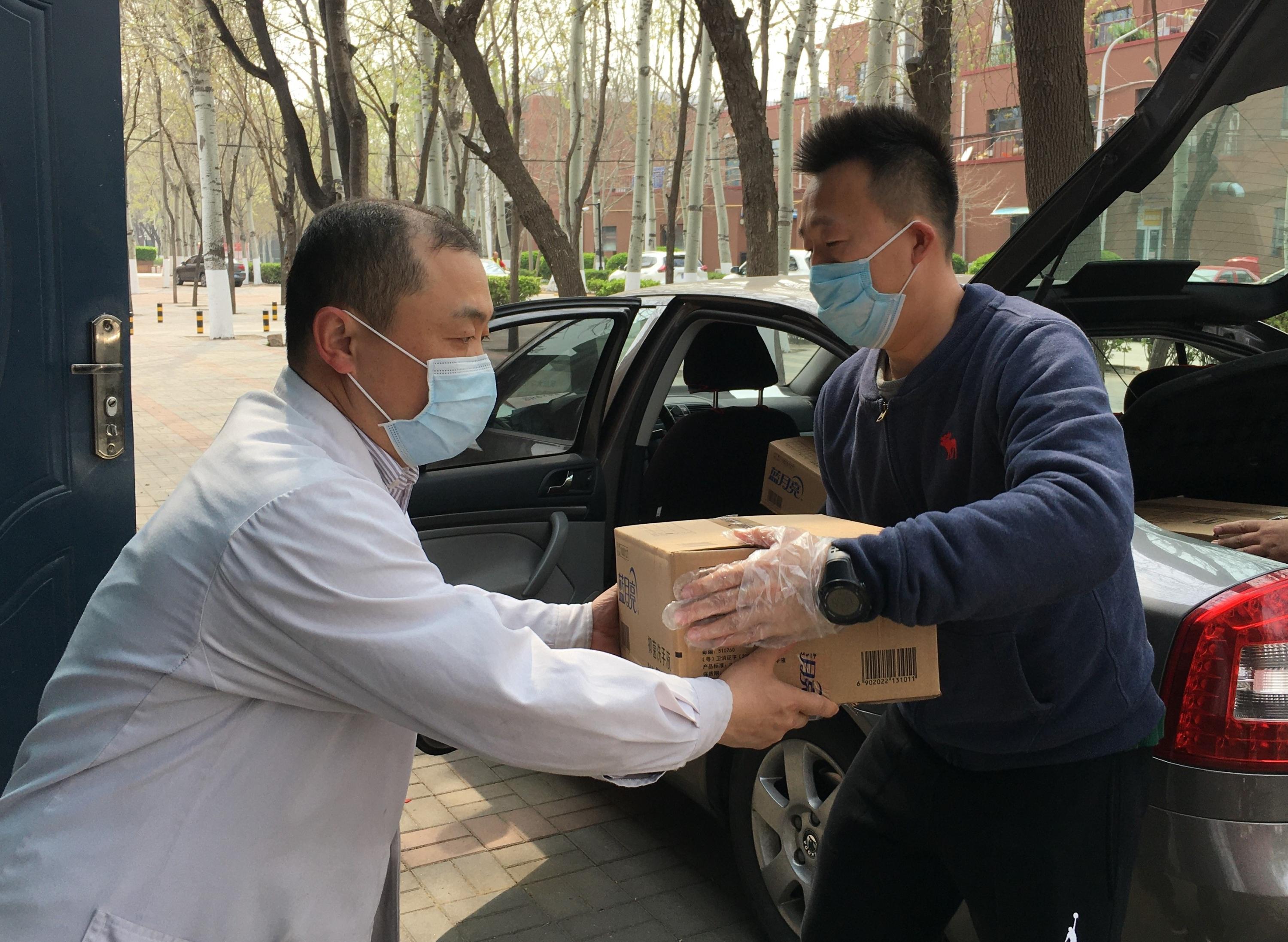 校医院工作人员将防疫物资交到教职工手上