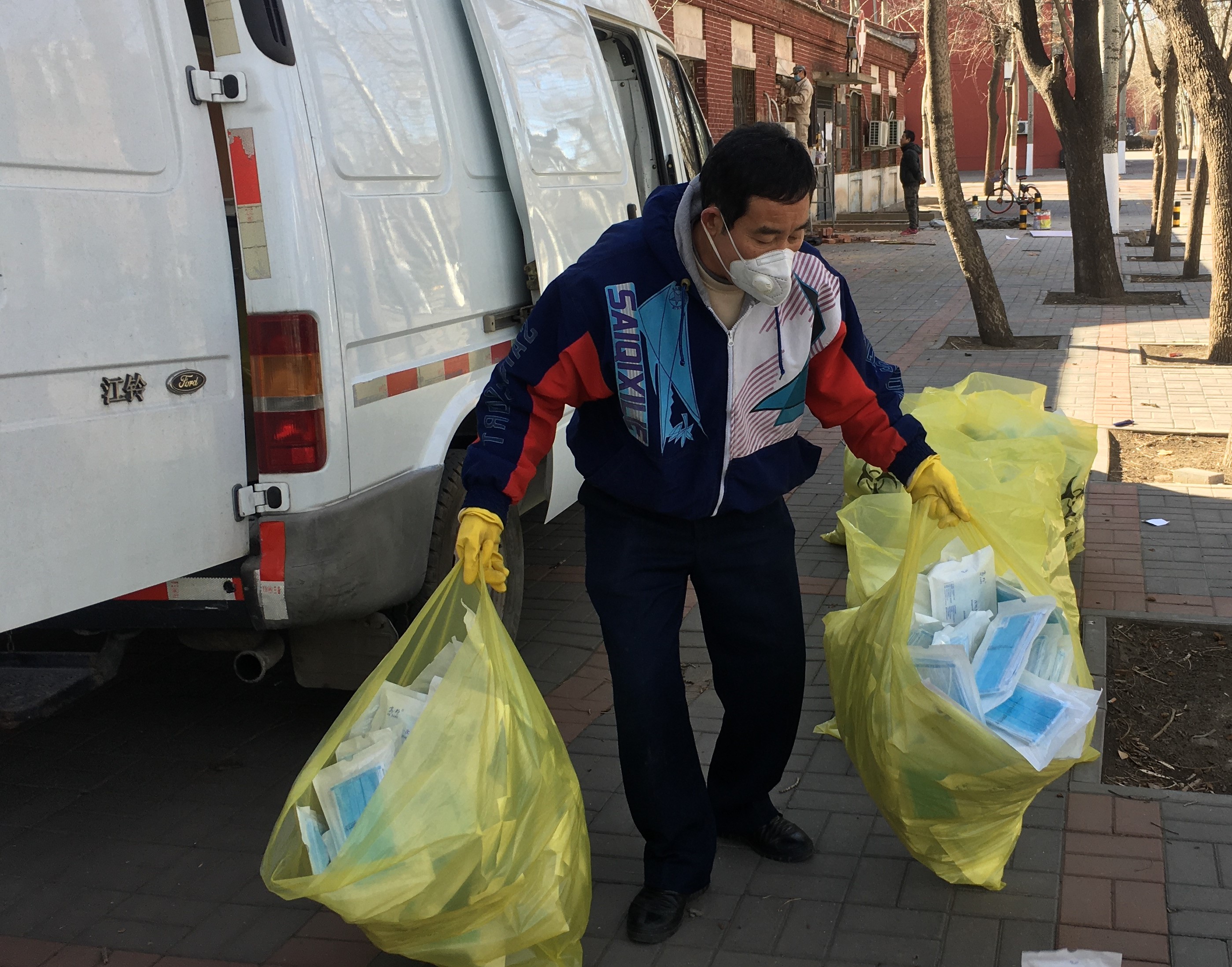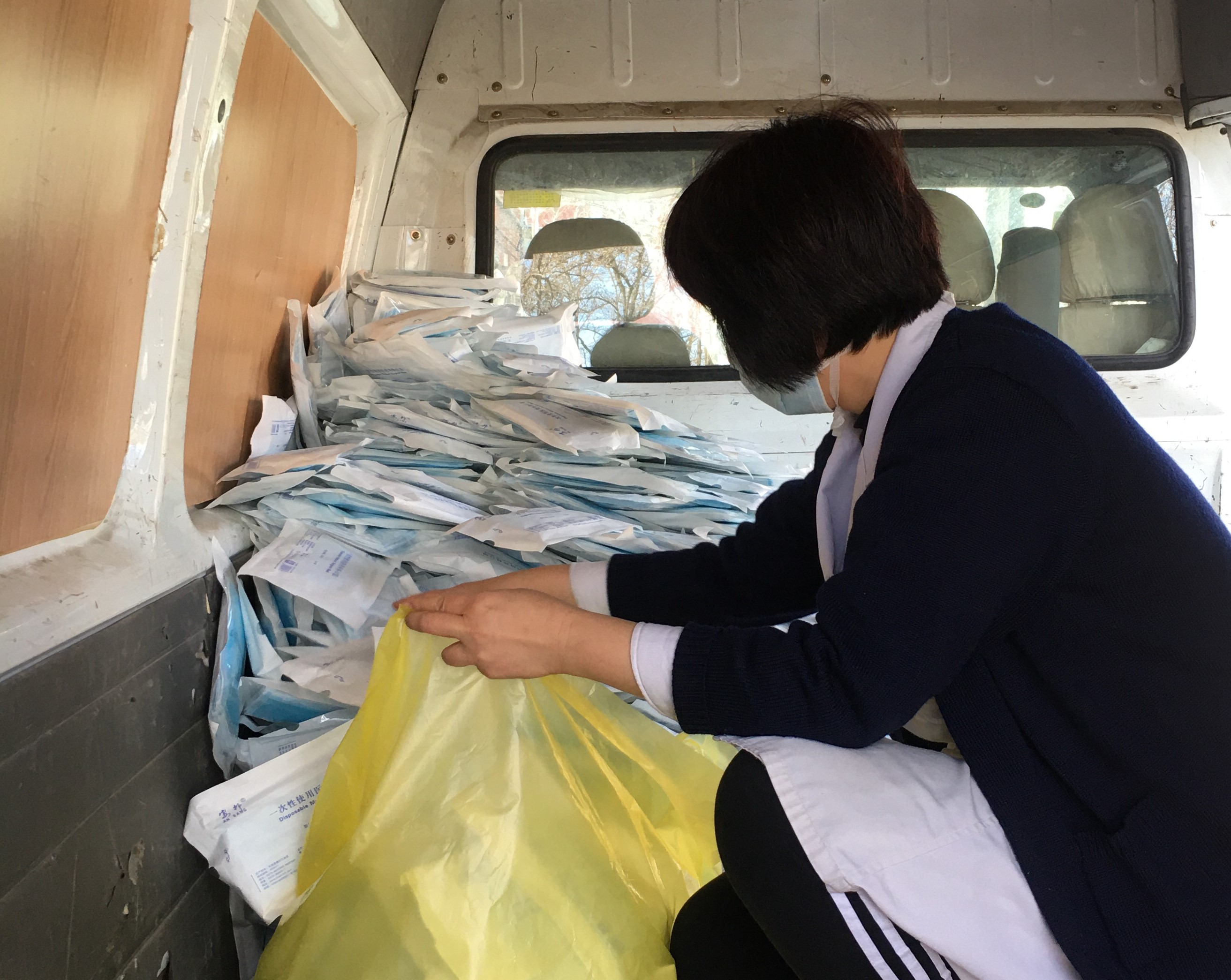 校医院工作人员清点民航总局调拨的第一批口罩并装袋