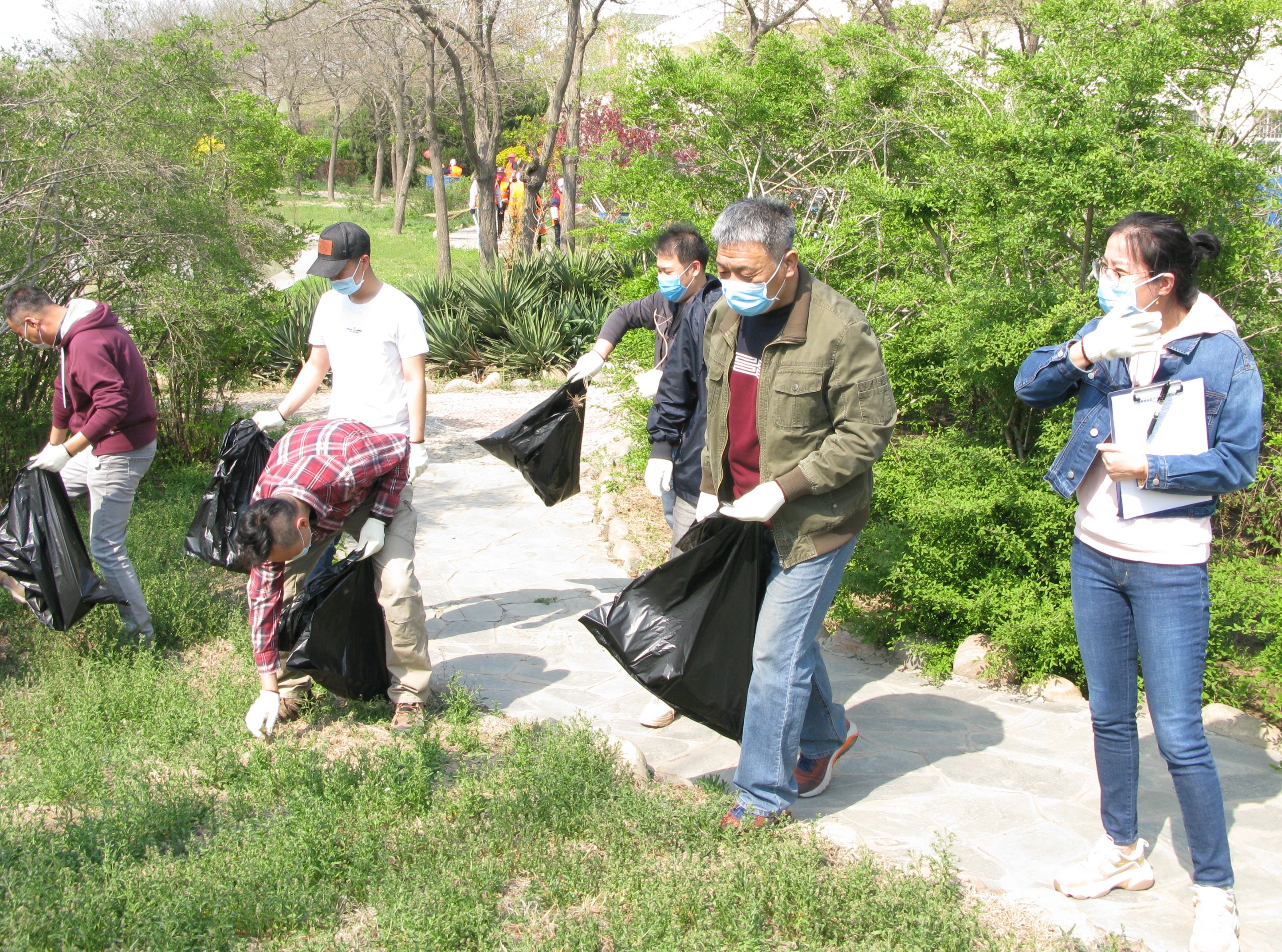 在南区千禧湖周边,校园管理服务中心工作人员给参加活动人员发放手套和垃圾袋,党员们沿着千禧湖捡拾树枝、塑料等垃圾并装袋,校园管理服务中心9名清洁工负责后期处理和将垃圾装车运走。在北区网球场,到处是飘飞的杨花柳絮,党员们用大扫帚将垃圾扫在一起,由清洁工装车拉走。在北区航空体育场,党员们清洁活动做得很仔细,他们还将篮球架下边的泥饼子铲掉,装车拉走。在北区田径足球场,党员们把杂草拔了,把垃圾清扫了。在北区篮球场和排球场,党员们拔草扫地,干了一个多小时……