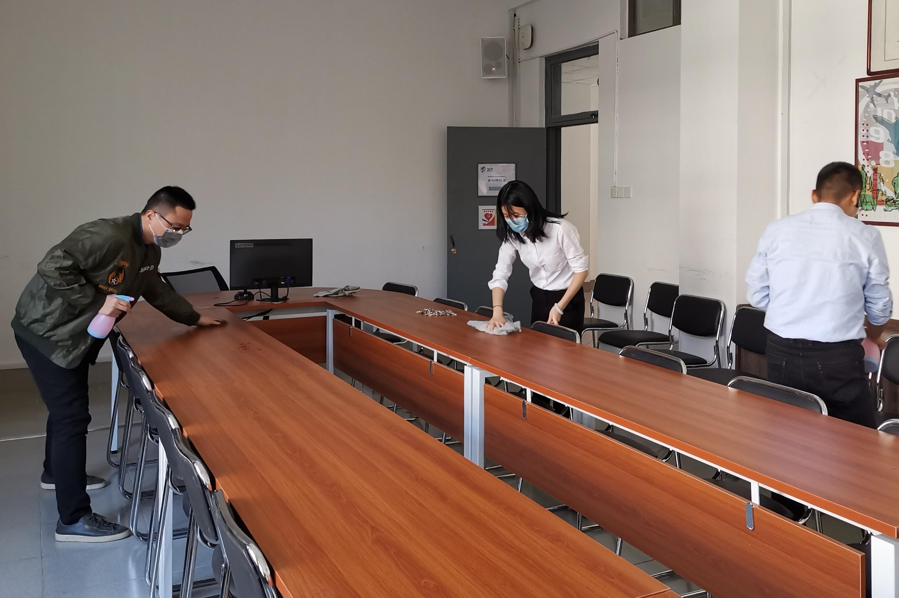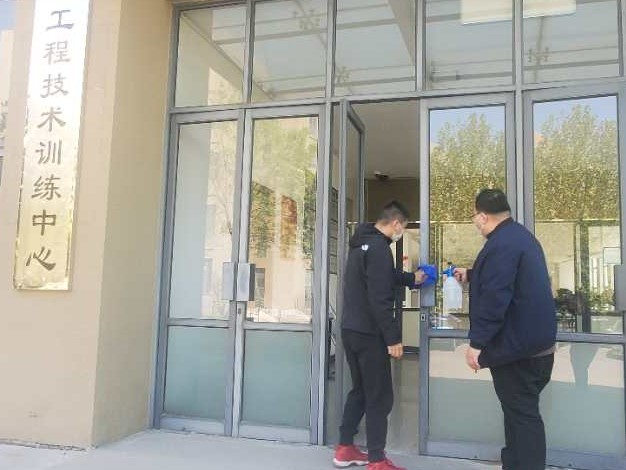 工程技术训练中心教职工对公共区域进行消毒