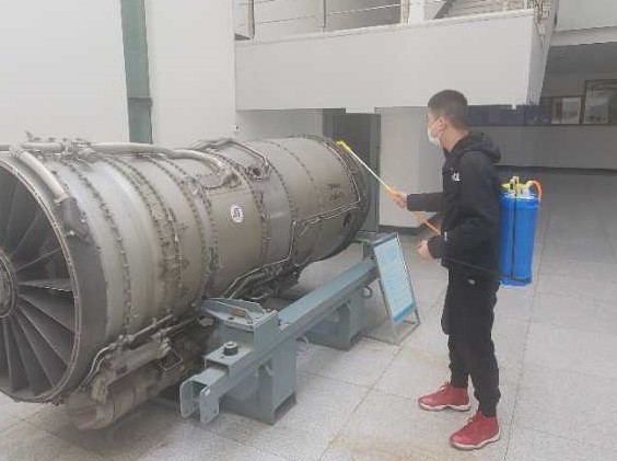 工程技术训练中心教职工在发动机大厅消毒