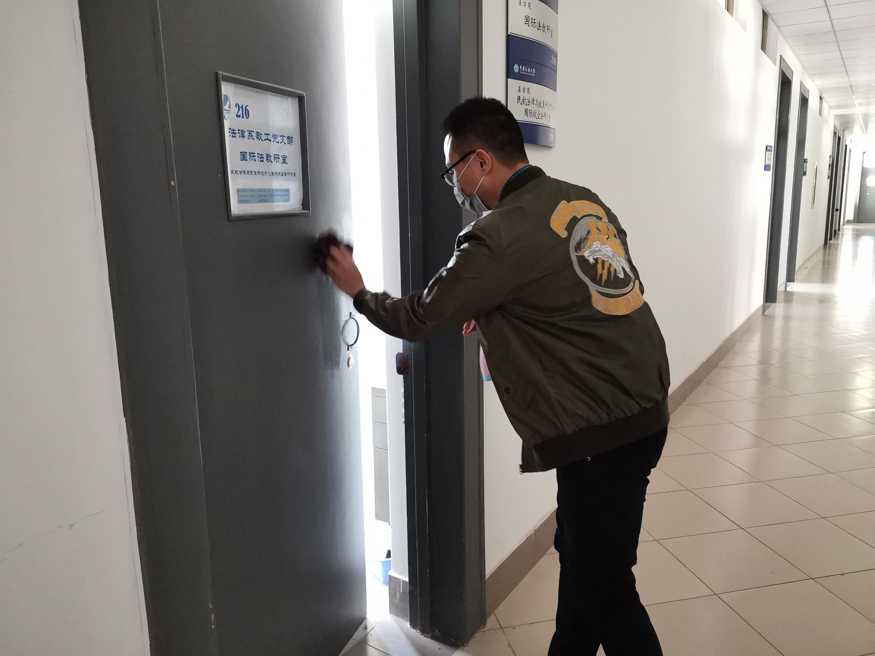 法学院党员用消毒液擦拭教研室大门
