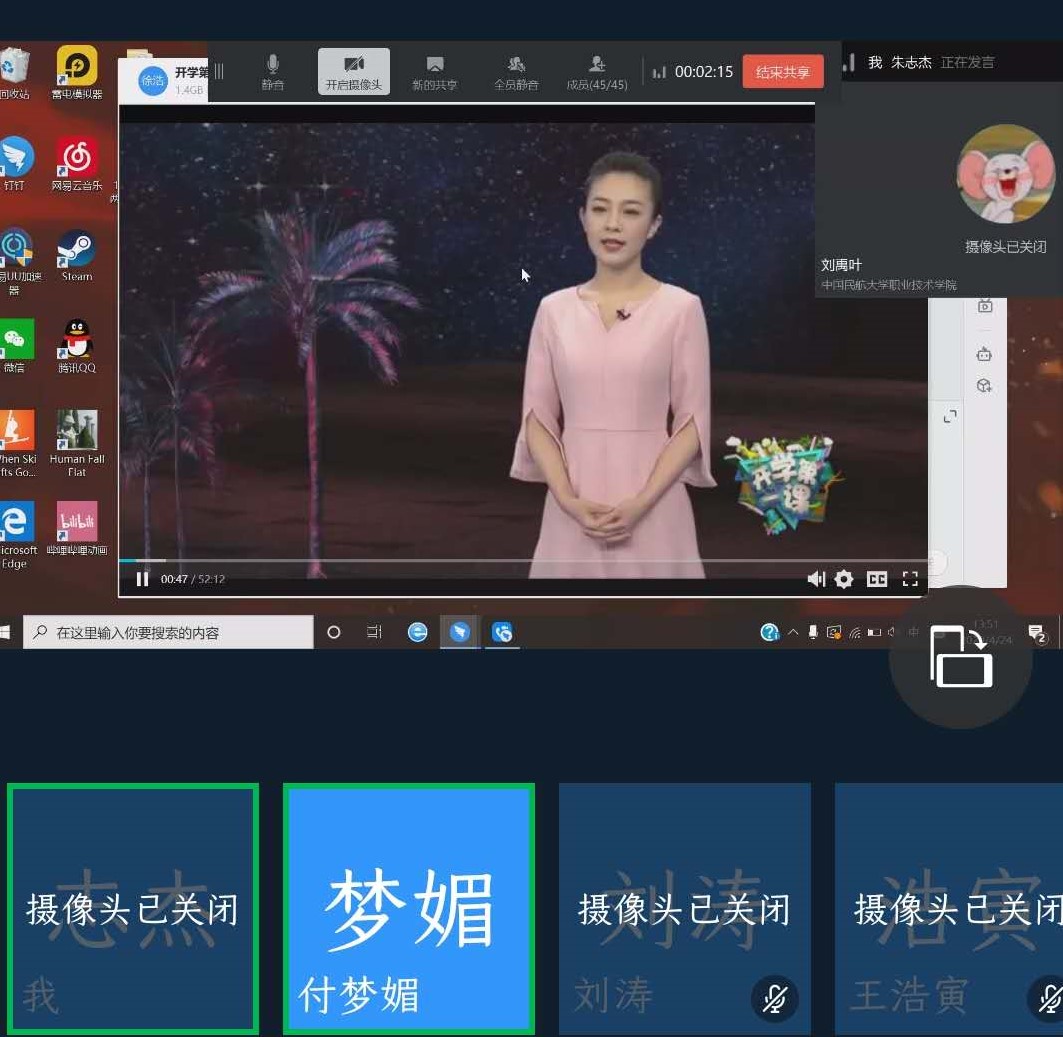 本网讯 连日来,中国民航大学组织全体学生观看《大自然在说话》生态文明教育公开课,各学院利用腾讯会议、钉钉等网络平台,通过召开党支部会、班会、团会等形式组织全体学生进行专题讨论,深化观看效果,共计开展讨论活动近300场,学生反响热烈。