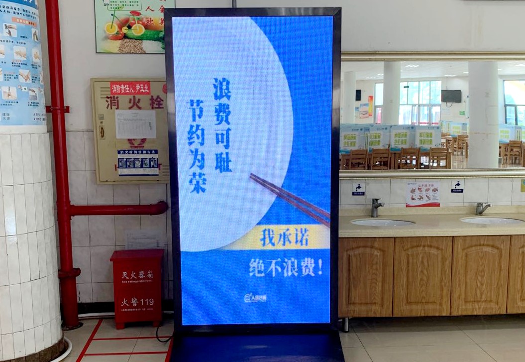 食堂内电子屏展示拒绝浪费宣传标语
